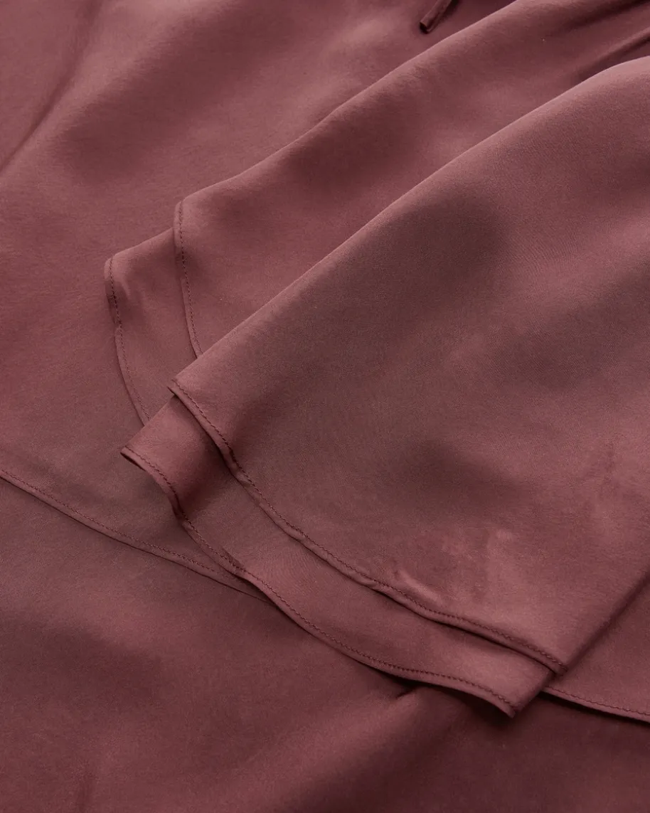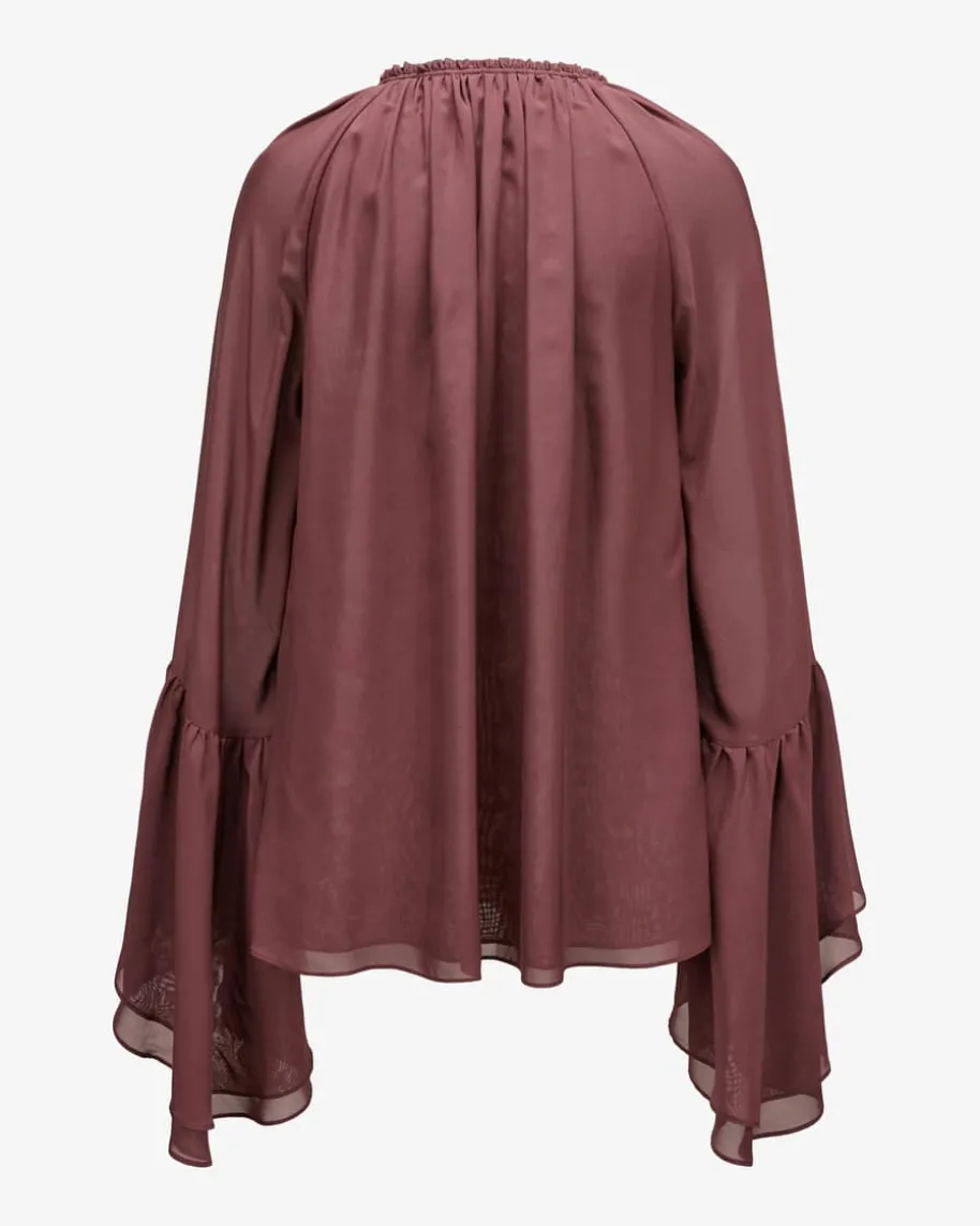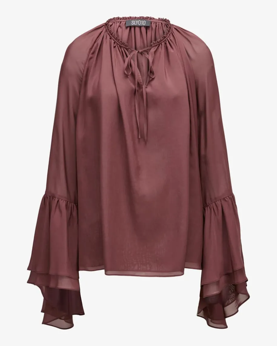 Seidentunika für Damen von SLY010 in Bordeaux. Das Modell besticht inromantischer Aufmachung dank der legeren Tunika-Passform, während zarte Rüschen-Details und asymmetrische Volant-Ärmel den femininen Look betonen. Zudem rundetdie exklusive Seide das Gesamtbild harmonisch ab.