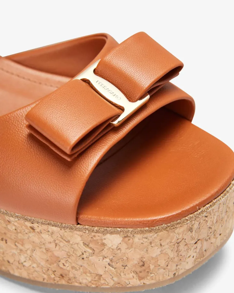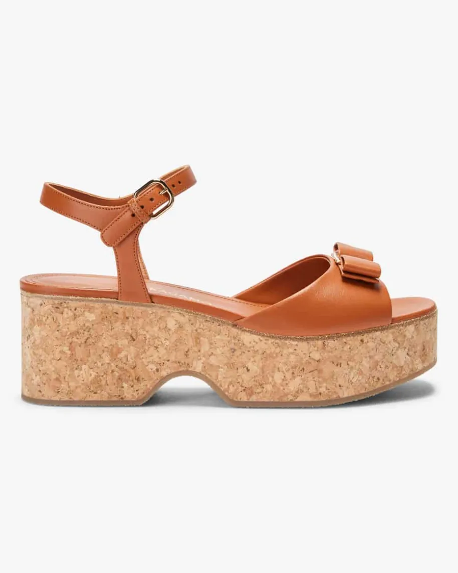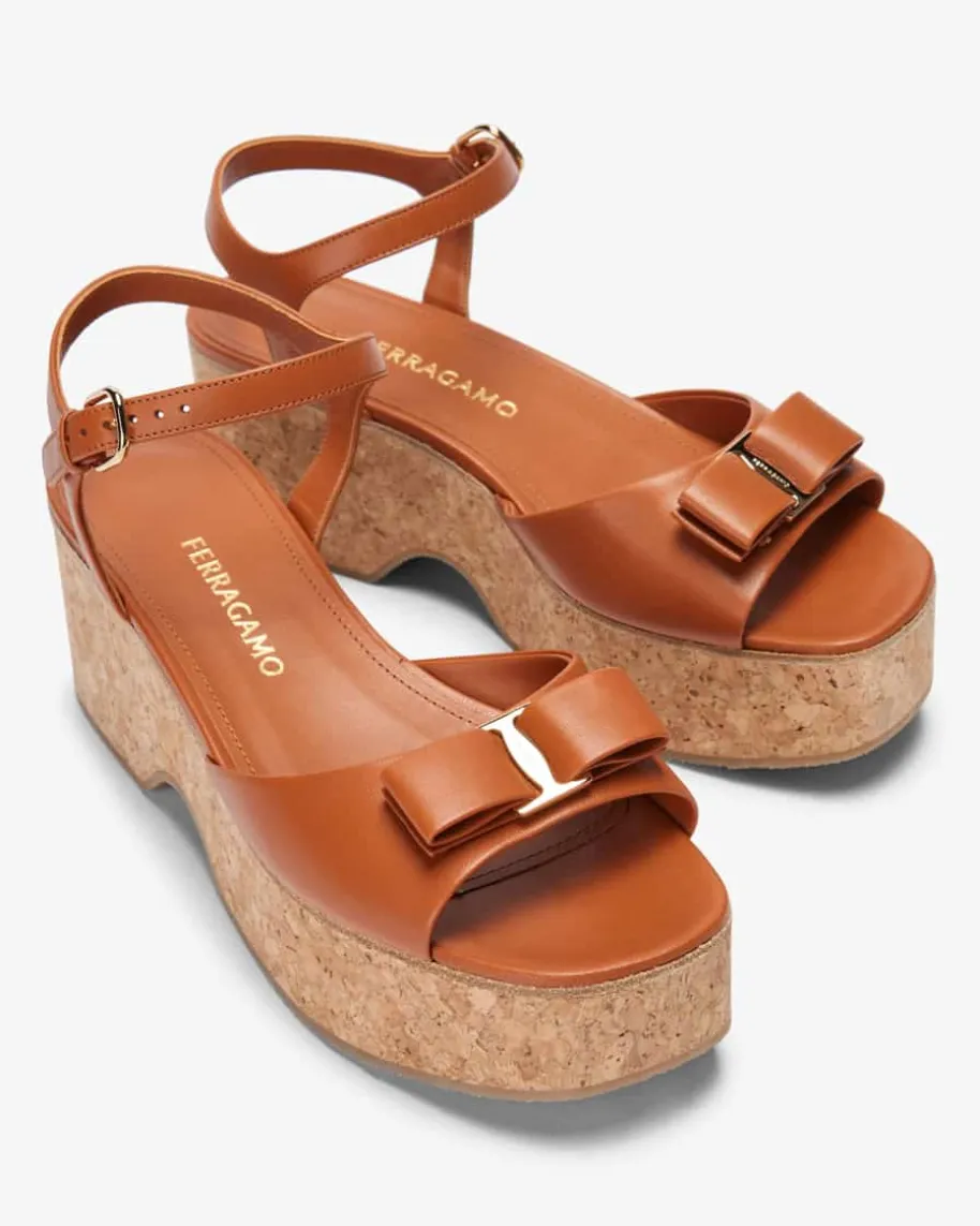 Selna Sandaletten für Damen von Ferragamo in Cognac. Ein sommerliches Highlightmit eleganter Note – Das Modell zeichnet sich durch die raffinierte Kombinationaus hochwertiger Lammleder-Verarbeitung und dem Kork-Plateauabsatz imoriginellen Wedges-Stil aus, welche durch die tonale Schleifen-Akzente stilvollin Szene gesetzt wird.