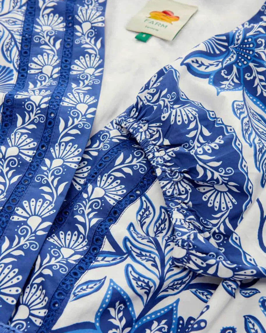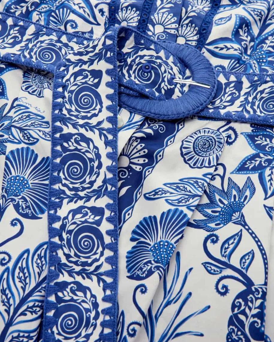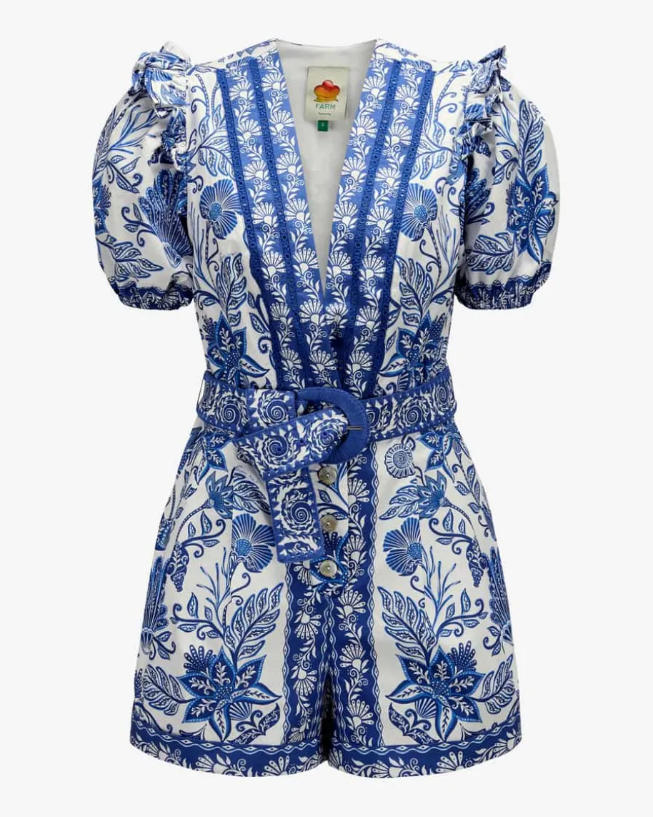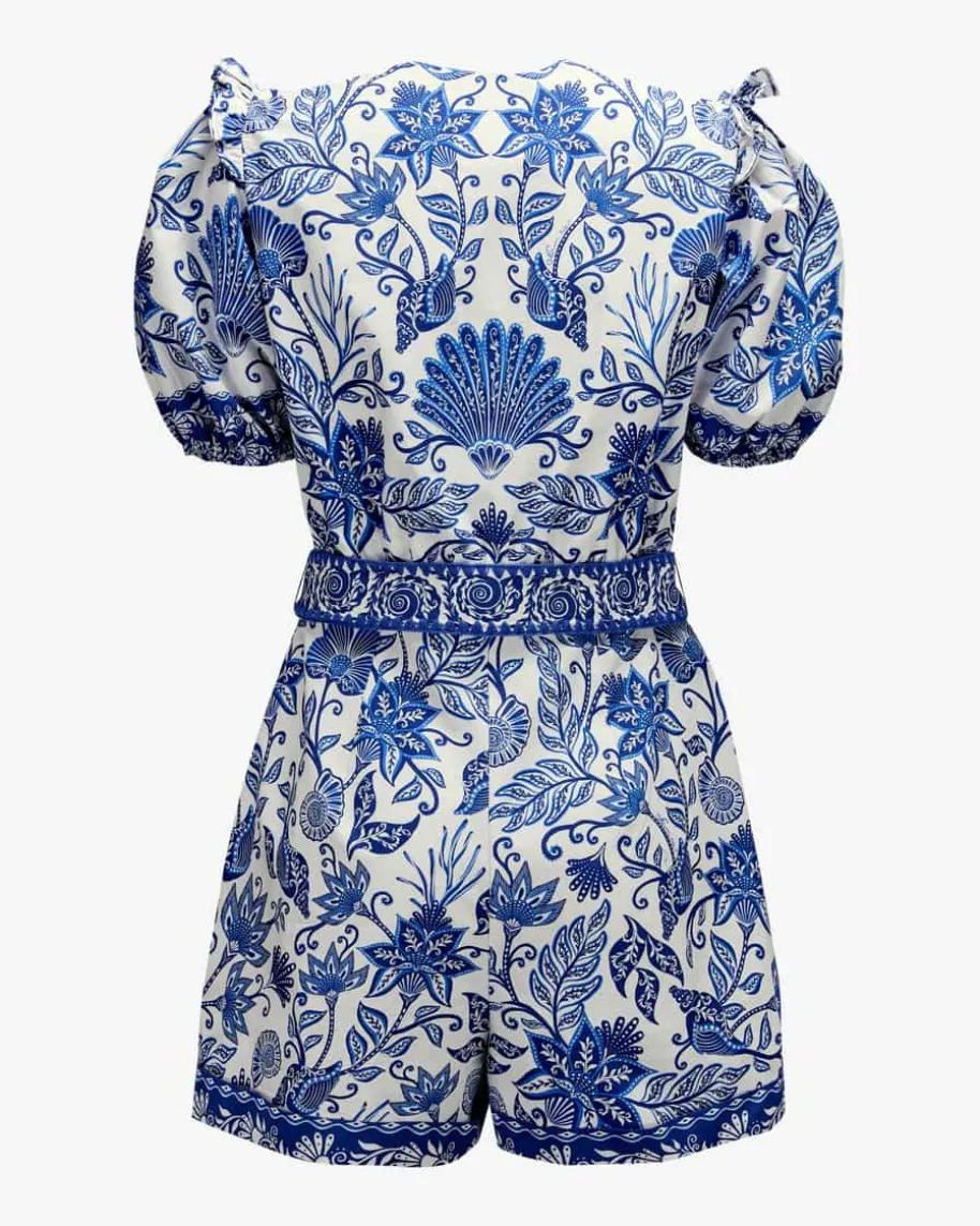 Shell Garden Jumpsuit für Damen von Farm Rio in Blau und Weiß. Das kurze Modellbegeistert mit glatter Baumwoll-Qualität und weiter Passform, welche dankpassendem Taillen-Stoffgürtel feminin in Szene gesetzt wird. Volants undLochstick-Borten verleihen zusammen mit dem detailverliebten Blumen- undMuschel-Print einen stilvollen Charakter mit sommerlichem Flair.