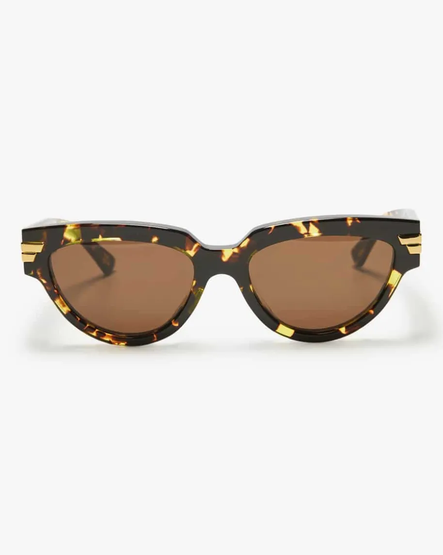Sonnenbrille für Damen von Bottega Veneta Eyewear in Dunkelbraun und Gelb.Dieses Modell avanciert dank der einzigartigen Havana-Aufmachung zumstilsicheren Accessoire für heiße Sommertage. Zugleich kreieren goldene Detailsam Bügel einen besonderen Blickfang.