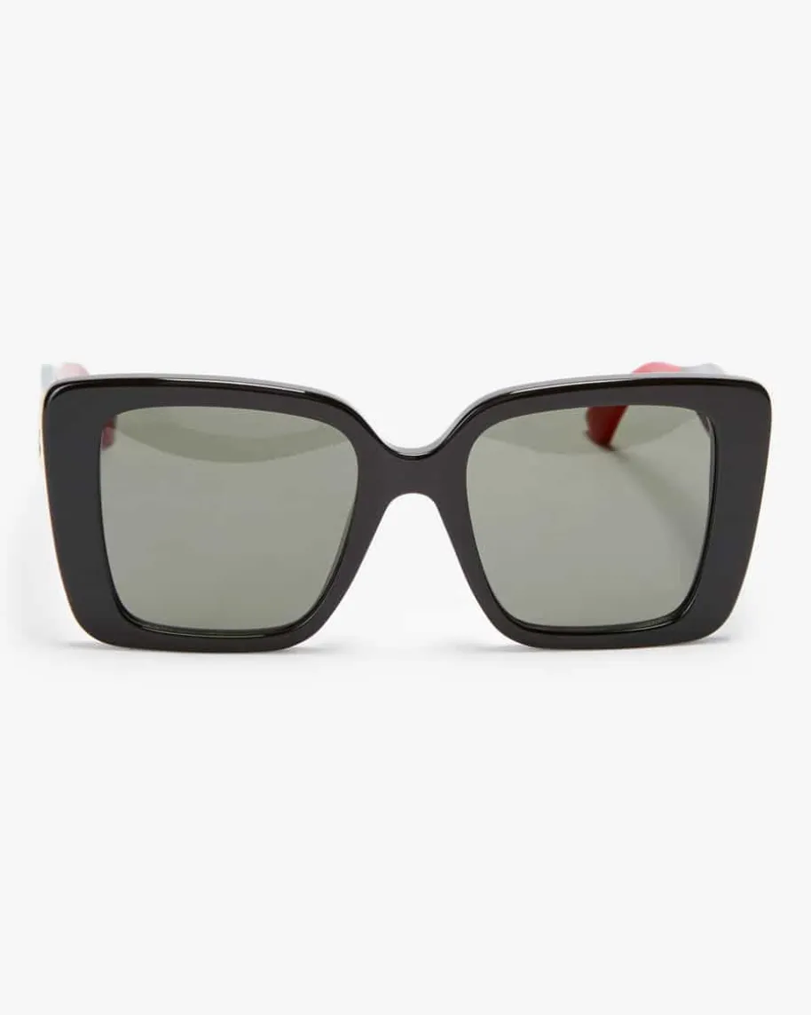 Sonnenbrille für Damen von Gucci Eyewear in Schwarz, Rot und Grün. DasAccessoire verleiht jedem Look dank dem markanten Rahmen in eckiger Form einenextravaganten Touch. Die goldfarbenen Logo-Details am Bügel sowie diecharakteristischen Gucci-Streifen runden das Modell gekonnt ab.