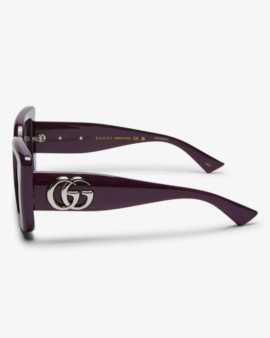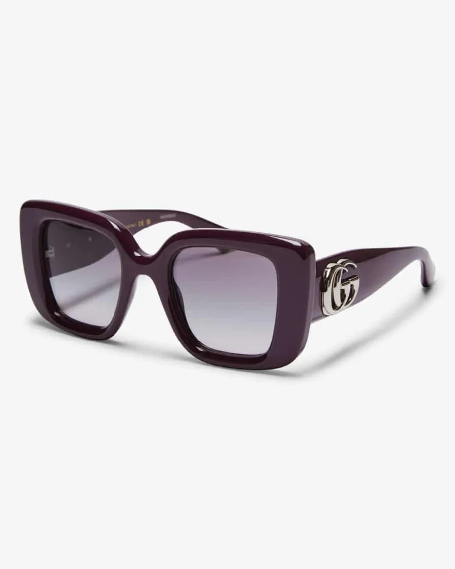 Sonnenbrille für Damen von Gucci Eyewear in Aubergine. Dank eckiger XL-Formavanciert das Modell mit breitem Rahmen in Hochglanz-Optik zum extravagantenHingucker an sonnigen Tagen. Die seitlichen, silberfarbenen Logo-Applikationenrunden die Brille charakteristisch ab.