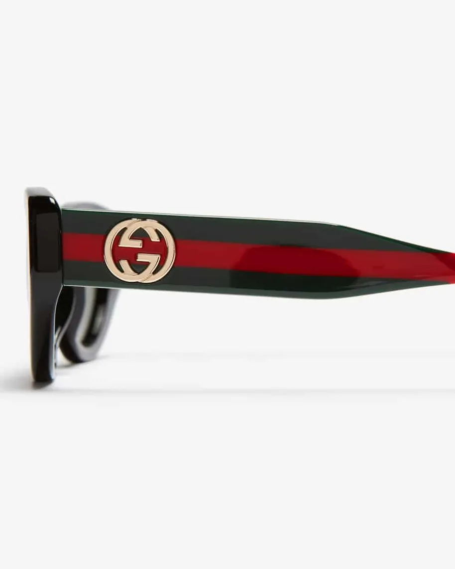Sonnenbrille für Damen von Gucci Eyewear in Schwarz, Dunkelgrün und Rot. DasModell besticht dank der ikonischen Farbkombination in modischer Aufmachung,während die getönten Gläser sowie die goldenen Logo-Details ein sommerlichesAccessoire kreiert.