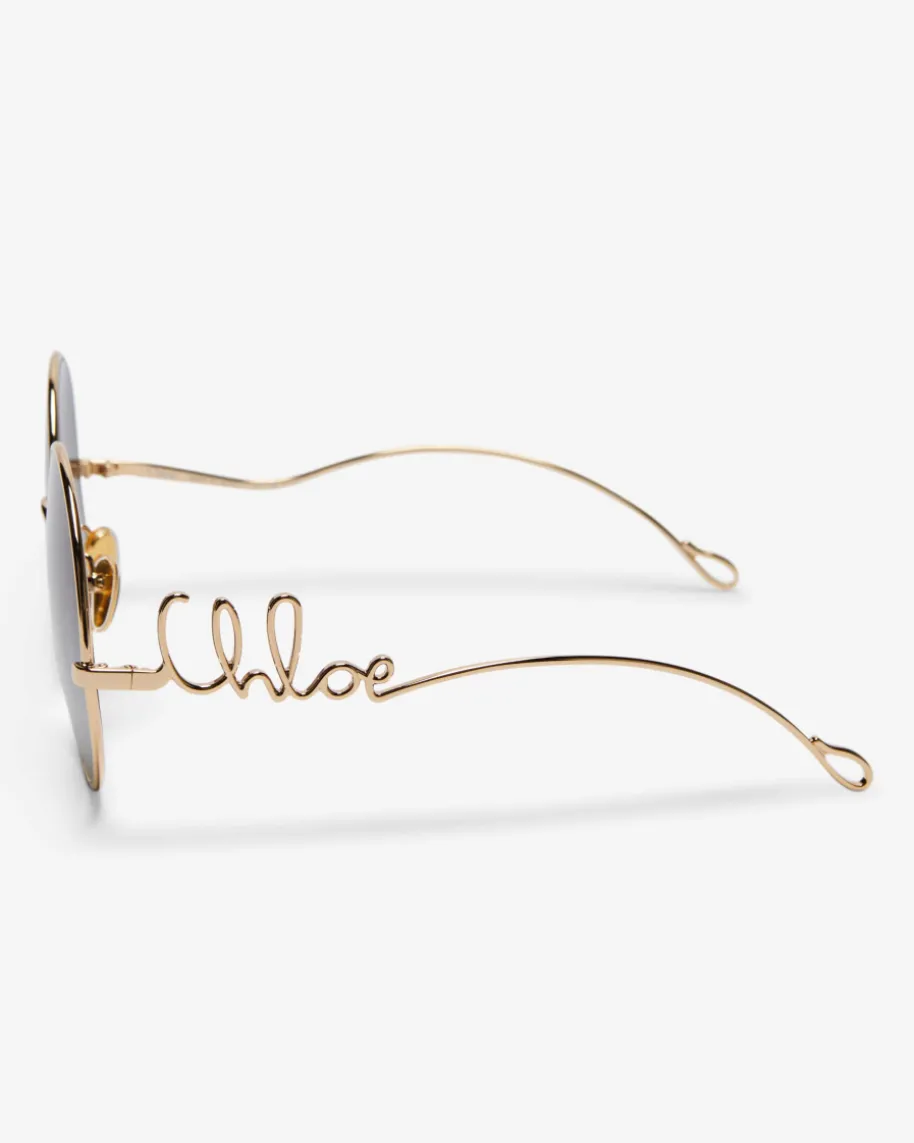 Sonnenbrille für Damen von Chloé Eyewear in Gold und Grau. Dank der großen Formmit runden Gläsern und Farbverlauf sowie dem schmalen, goldfarbenen Metall-Rahmen überzeugt das Modell als extravagantes Highlight für sonnige Tage.Zugleich verleiht der Bügel in verformter Aufmachung mit eingearbeiteten Logo-Schriftzug einen besonderen Charakter.