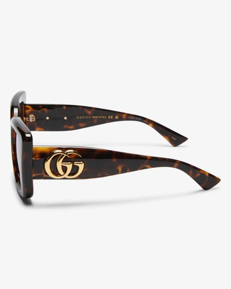 Sonnenbrille für Damen von Gucci Eyewear in Braun. Dank eckiger XL-Formavanciert das Modell mit breitem Rahmen in Havana-Optik zum extravagantenHingucker an sonnigen Tagen. Die seitlichen, goldfarbenen Logo-Applikationenrunden die Brille charakteristisch ab.