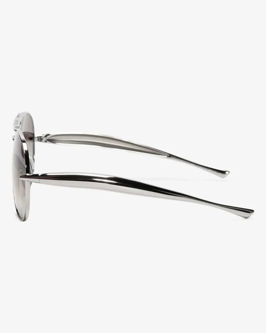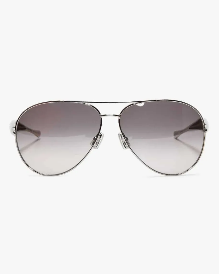 Sonnenbrille von Bottega Veneta Eyewear in Silber und Dunkelgrau. Das Modellpräsentiert sich dank der stilvoll-eleganten Aufmachung als modischer Begleiterfür sommerliche Looks, während die gefärbten Gläser in Piloten-Form den letztenSchliff verleihen.