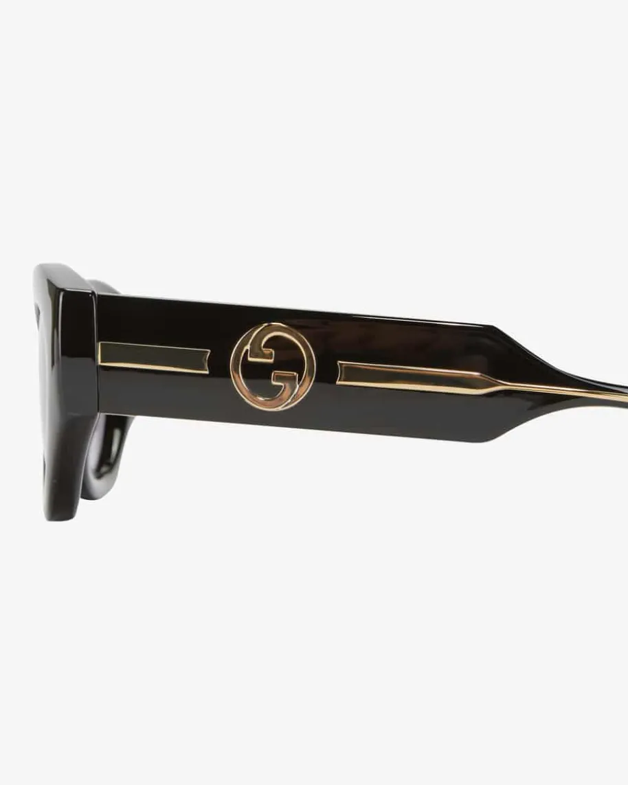 Sonnenbrille für Damen von Gucci Eyewear in Schwarz und Gold. Dieses Modellavanciert dank dem markanten Rahmen mit ovalen Gläsern zum trendsicherenAccessoire für sonnige Tage. Zugleich kreieren die Horn-Optik sowie diegoldfarbigen Logo-Details einen besonderen Blickfang.