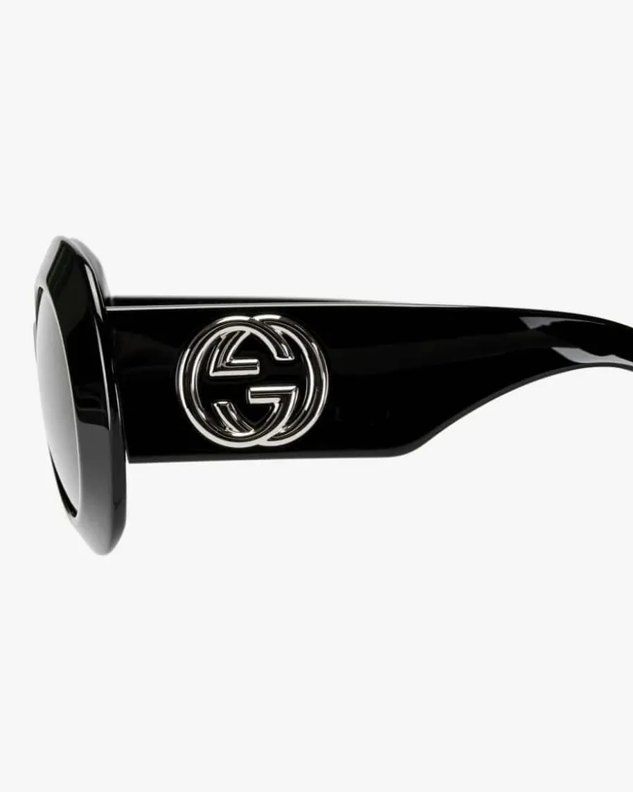 Sonnenbrille für Damen von Gucci Eyewear in Schwarz. Dieses große Modellavanciert dank dem breiten Rahmen zum extravaganten Begleiter für sonnige Tageund garantiert zudem dramatisch-elegante Auftritte. Zugleich runden diemarkanten Logo-Applikationen an den Bügeln den Look gekonnt ab.