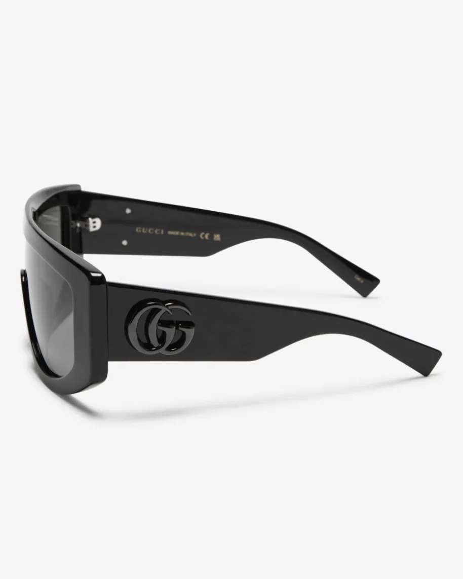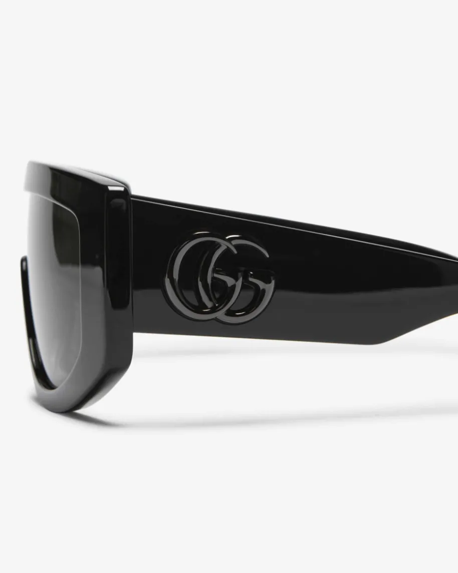 Sonnenbrille für Damen von Gucci Eyewear in Schwarz. Dank extravaganter, eckigerForm imsportiv interpretierten Aviator-Style avanciert das Modell mit breitem Rahmenzum modischen Begleiter für sonnige Tage. Die seitlichen Logo-Applikationen inChrom-Optik runden die Brille charakteristisch ab.