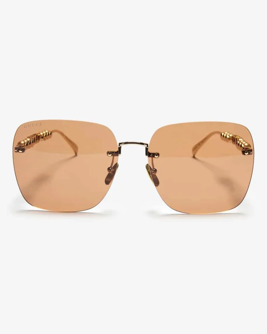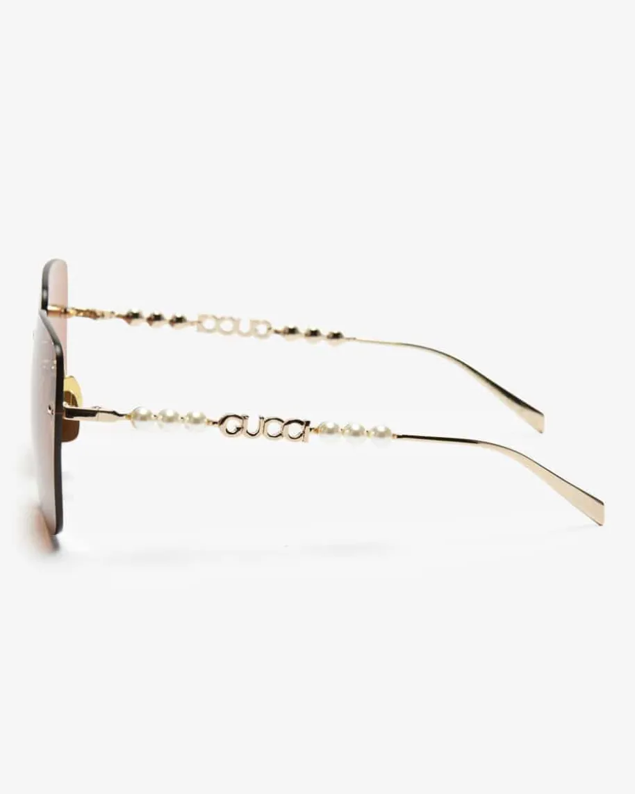 Sonnenbrille für Damen von Gucci Eyewear in Gold, Off-White und Bronze. Dank dergoldfarbenen Metall-Optik sowie der filigranen Bügel mit Schmucksteinen inPerlen-Aufmachung besticht das Modell in modischer Aufmachung, während dieextravaganten Gläser mit Tönung ein stilvolles Gesamtbild schaffen.