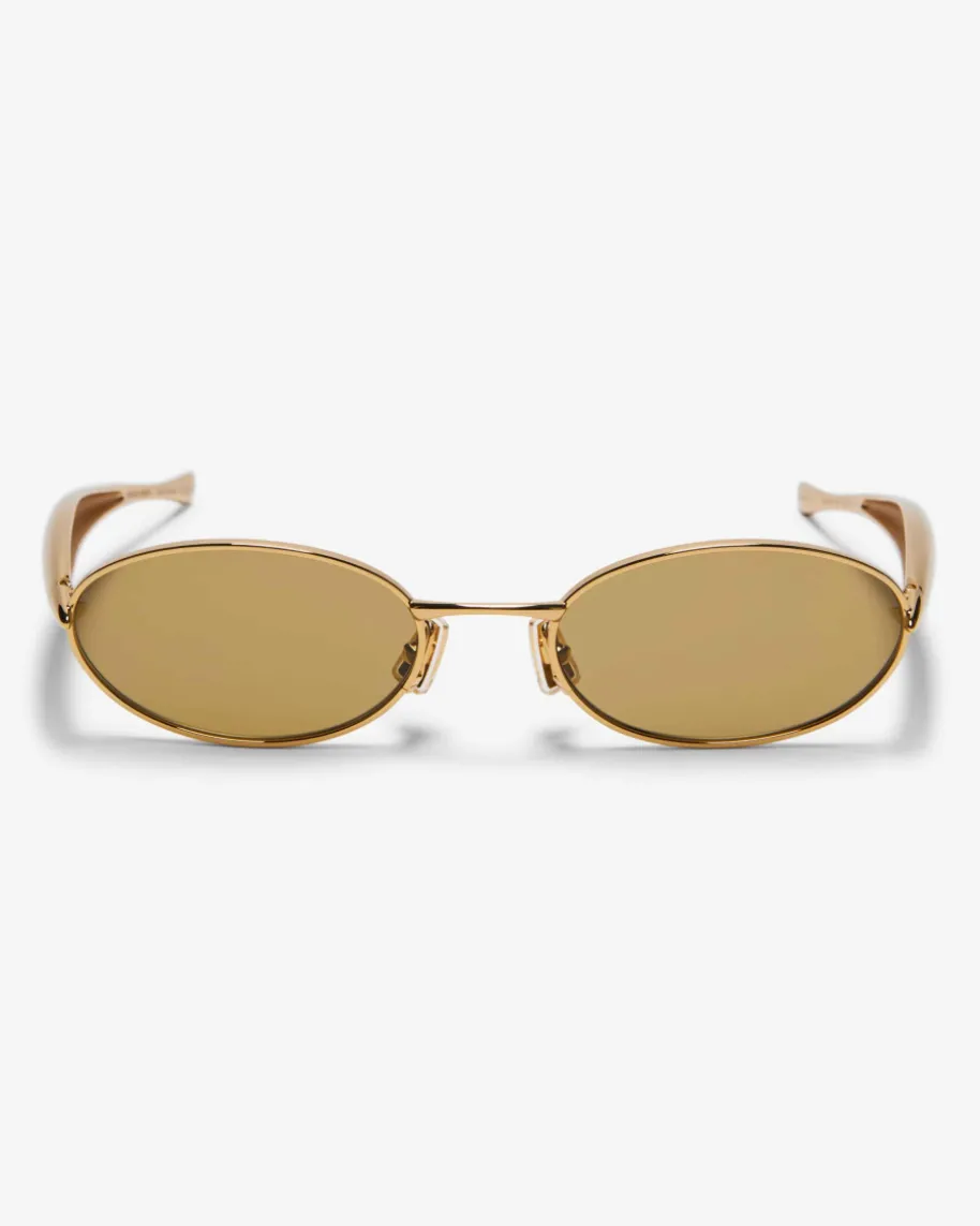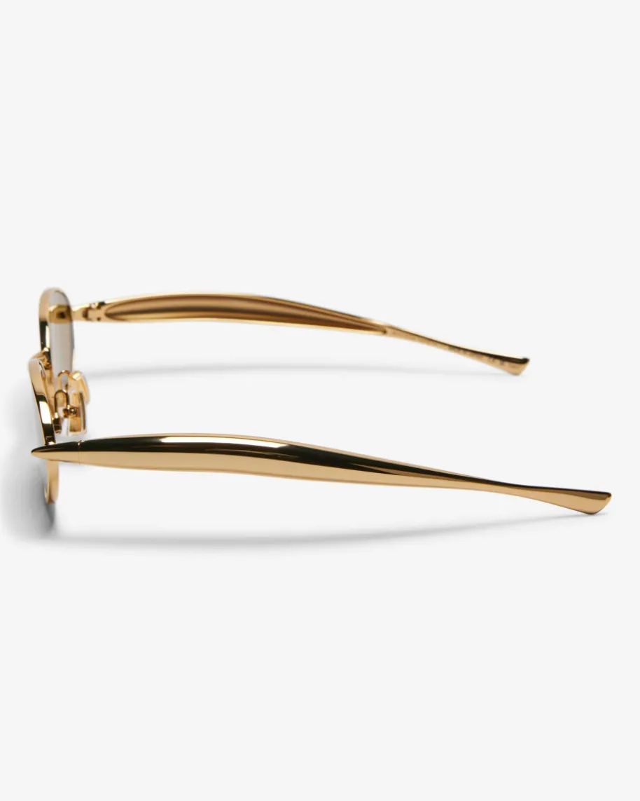Sonnenbrille von Bottega Veneta Eyewear in Gold. Dank der ovalen Form sowie demschmalen Rahmen überzeugt das Modell als moderner Begleiter für sonnige Tage,während die markanten, breiten Bügel einen futuristischen Charakter verleihen.