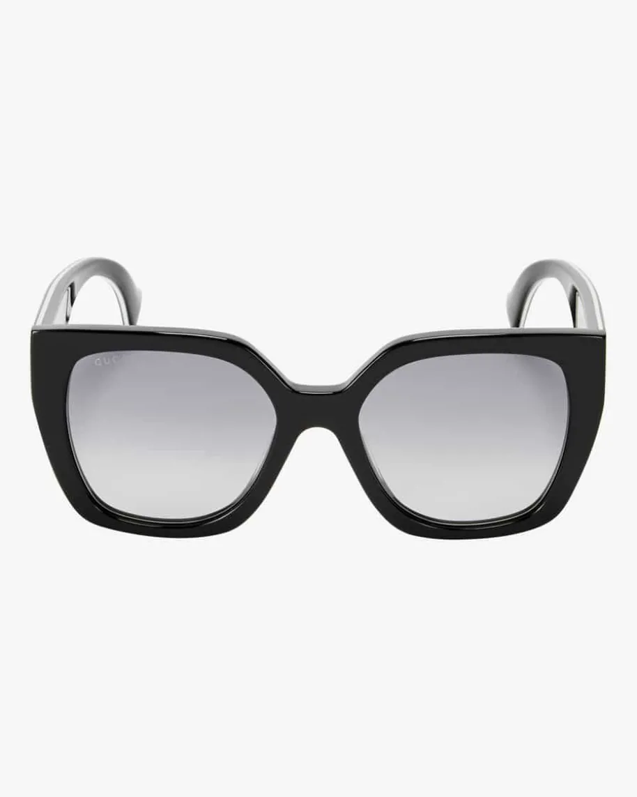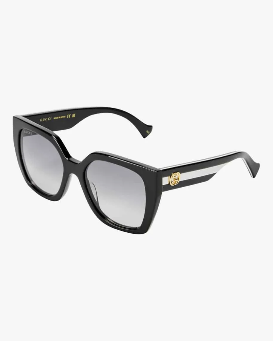 Sonnenbrille für Damen von Gucci Eyewear in Schwarz und Weiß. Dieses großeModell avanciert dank dem eckigen Rahmen sowie den hell getönten Gläsern zummodischen Begleiter für stilvolle Looks. Zugleich runden die goldfarbenen Logo-Applikationen sowie der Kontrast-Streifen an den Bügeln den Look gekonnt ab.
