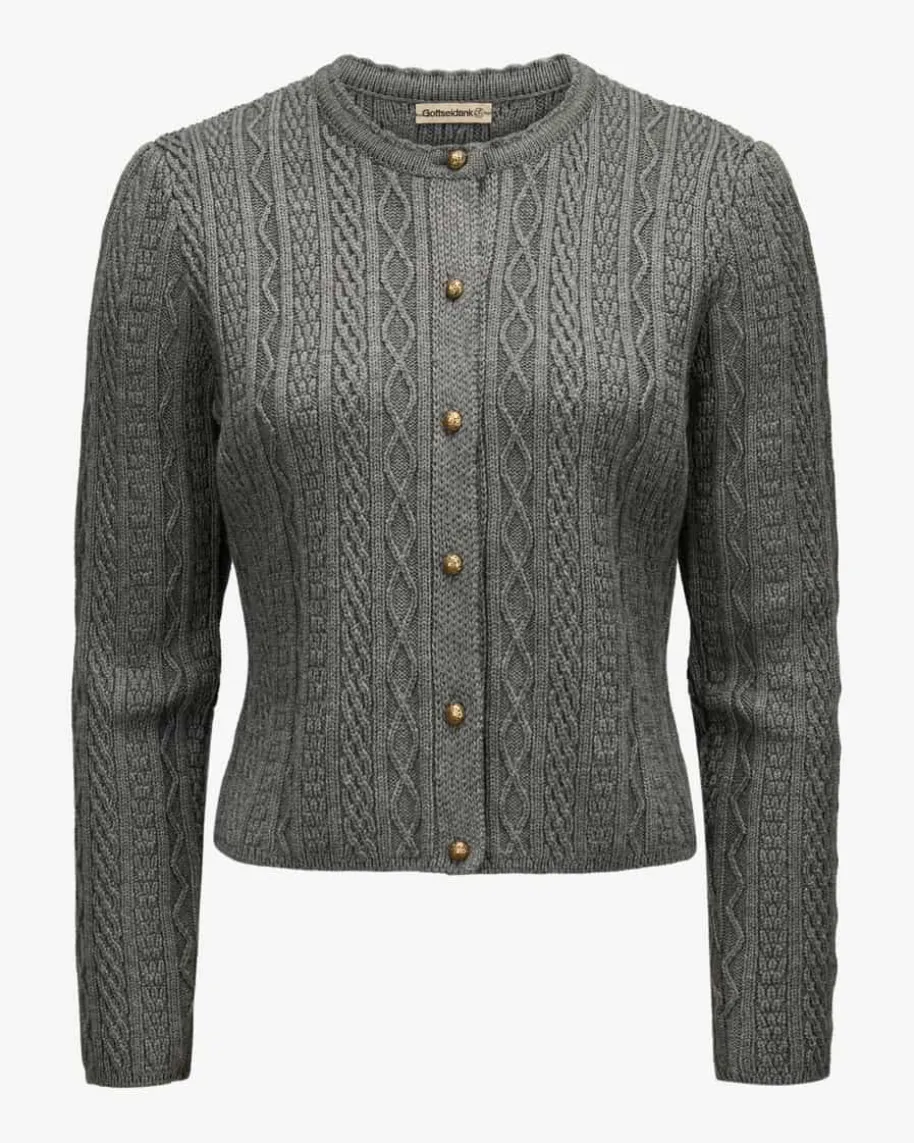 Sophia Trachten-Strickjacke für Damen von Gottseidank in Dunkelgrau. Diehochwertige Merinowolle mit feinen Zopfstrick-Muster punktet mit besondersangenehmem Tragekomfort, während stilvolle Kugelknöpfe sowie die Raffungen anden Schultern das traditionelle Modell gekonnt vollenden.