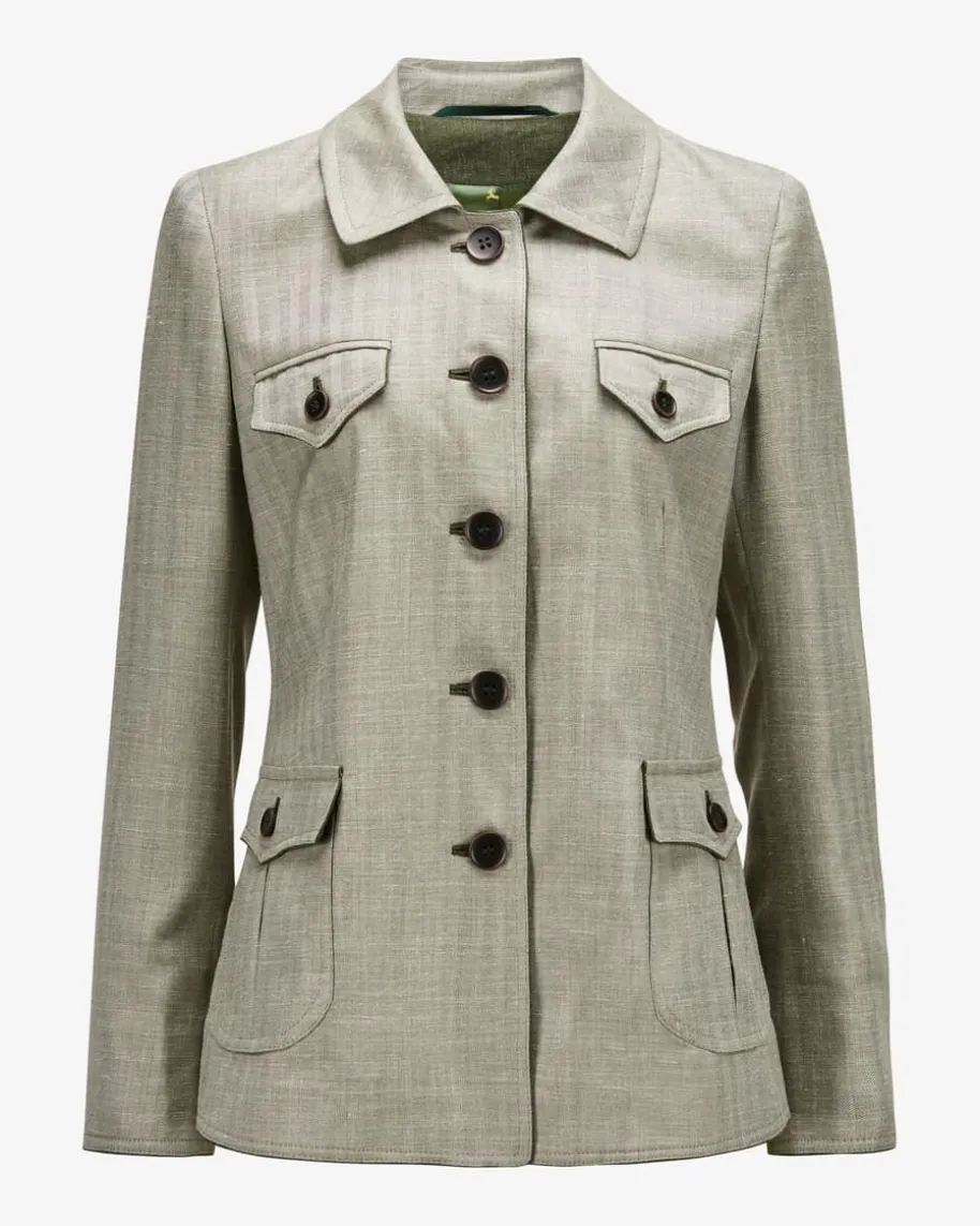 Sophie Trachtenjacke für Damen von Poldi in Oliv und Dunkeloliv. Dastraditionelle Modell wird durch den hochwertigen Schurwolle-Seiden-Leinen-Mixgekonnt In Szene gesetzt, während das melierte Fischgrätmuster ihrem Trachten-Begleiter ein stilvolles Finish verleiht. Zugleich runden geknöpfteKlappentaschen den Look harmonisch ab.