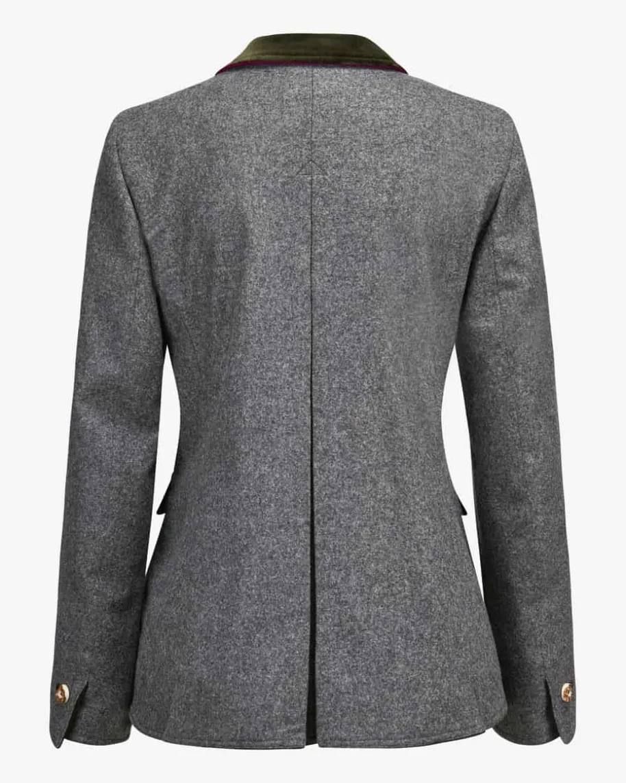 Sophie Trachtenjacke für Damen von Poldi in Grau und Dunkeloliv. Dastraditionelle Modell wird durch die hochwertige Schurwolle gekonnt in Szenegesetzt, während die weichen Samtbesätze ihrem Trachten-Begleiter ein stilvollesFinish verleihen. Zugleich runden geknöpfte Klappentaschen mit markantenHornknöpfen den Look harmonisch ab.
