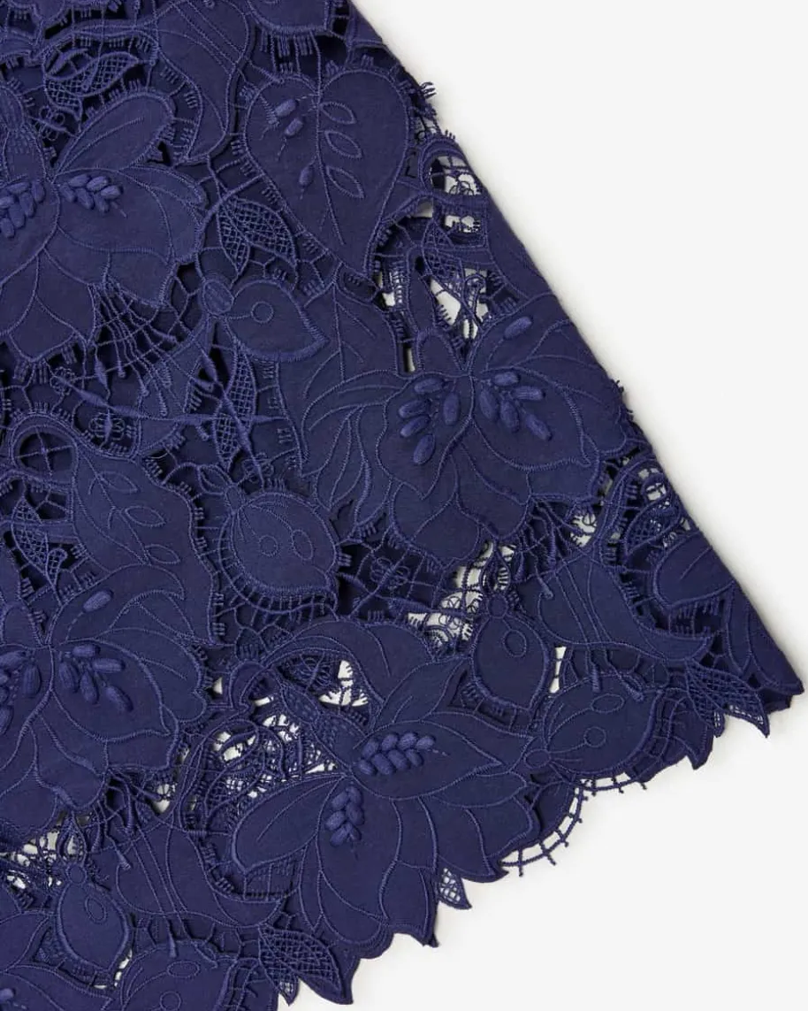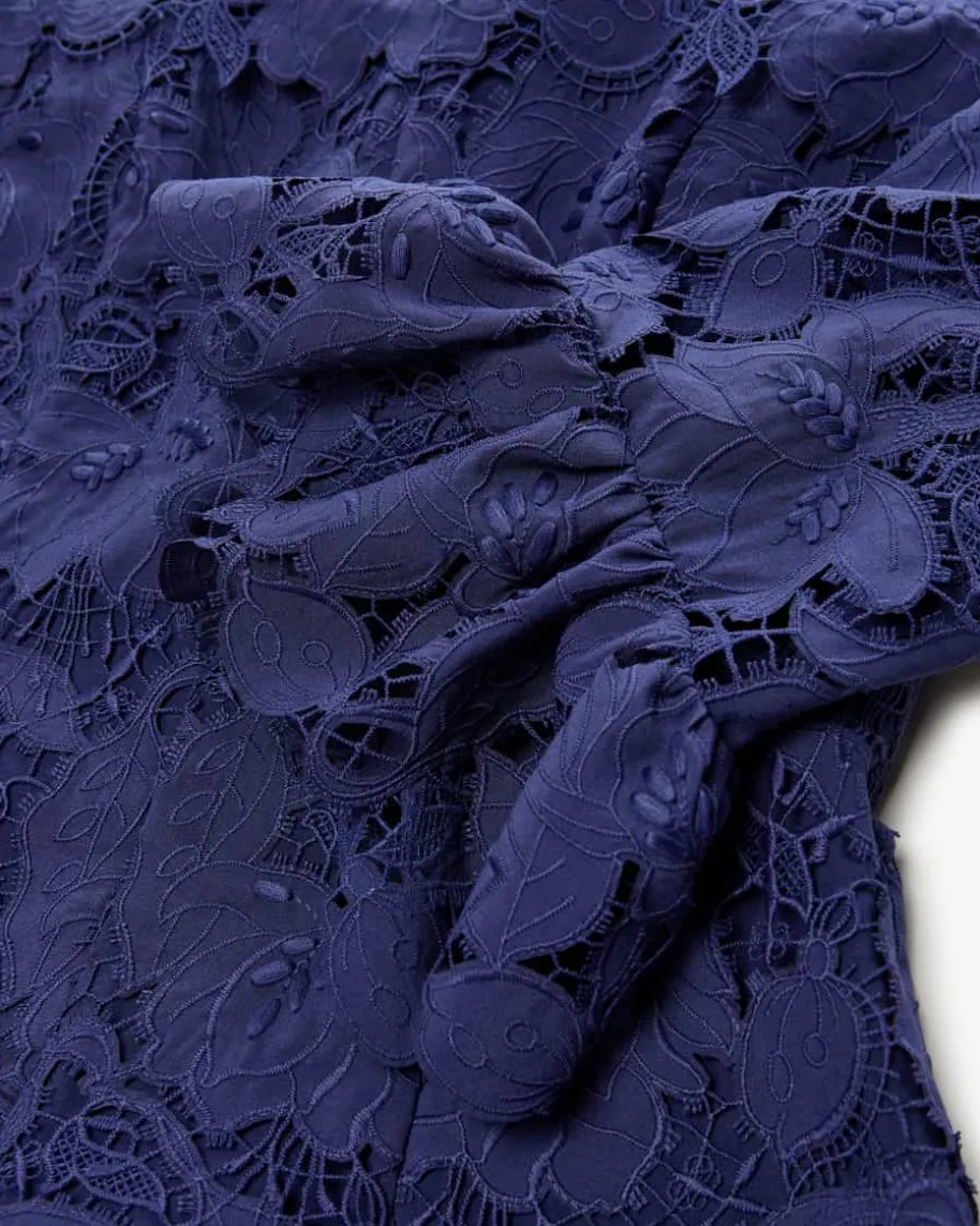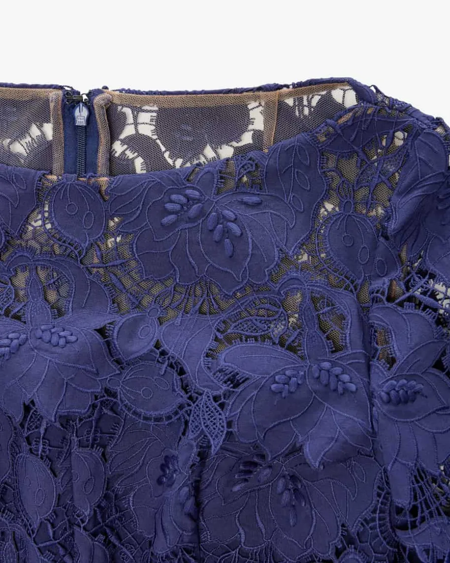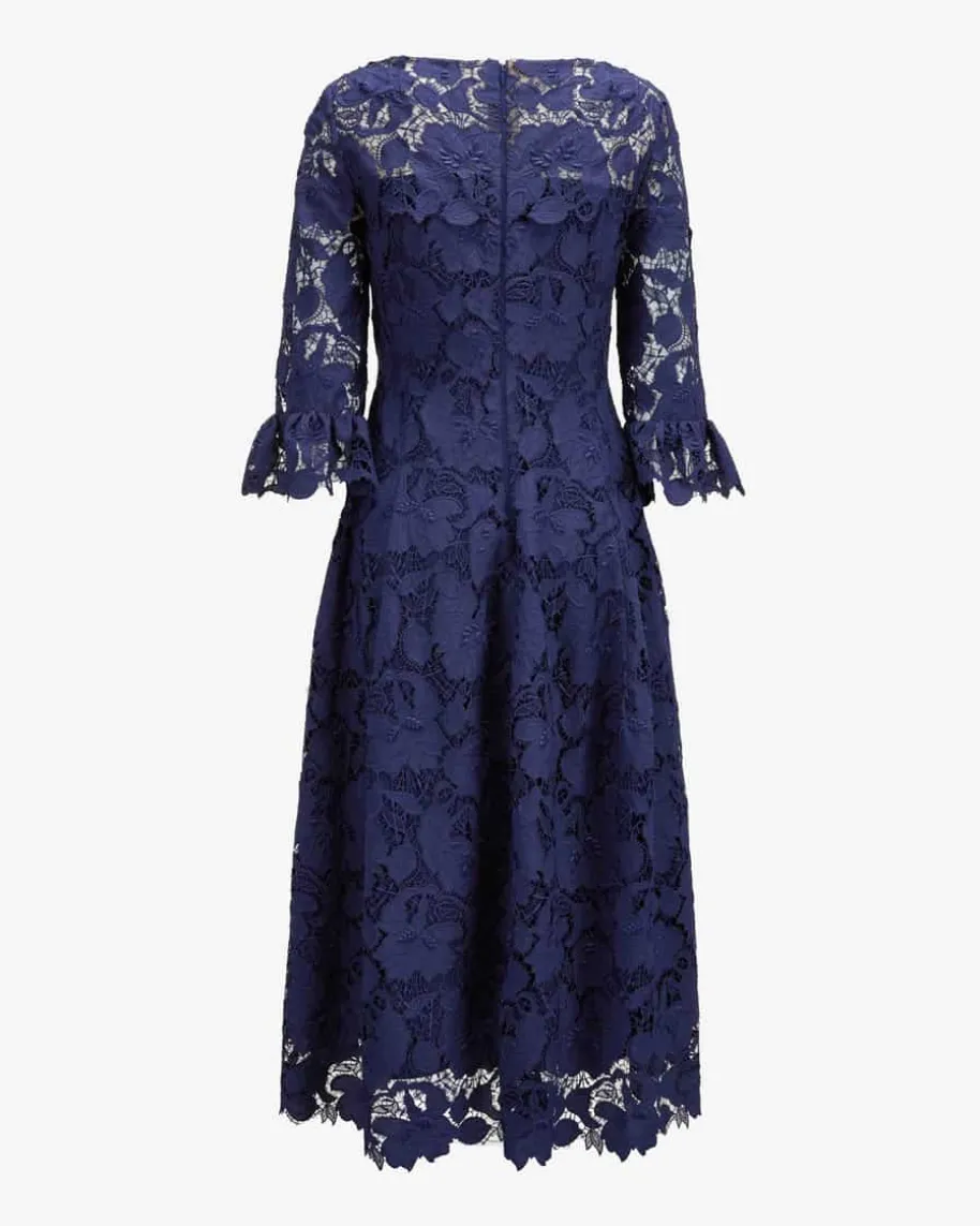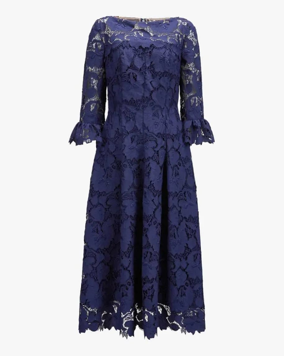 Spitzenkleid für Damen von Talbot Runhof in Dunkelblau. Das deutsche Designer-Duo ist bekannt für feminine Designs, die sich durch raffinierte wie auchhochwertige Schneiderkunst auszeichnen. Auch dieses Midi-Modell präsentiert sichdank der floralen Spitzen-Aufmachung sowie den Volants-Ärmelabschlüssen infemininer Eleganz, welche durch die semitransparenten Partien gekonntunterstrichen wird – Ein festlicher Begleiter mit Stil.