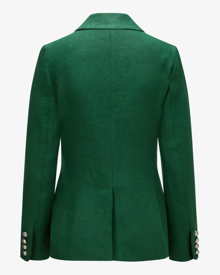 St. Gallen Trachten-Leinenblazer für Damen von LODENFREY München 1842 inDunkelgrün. Tradition und Moderne in perfektem Zusammenspiel – Das taillierteModell aus reiner Leinen-Qualität präsentiert sich in fein strukturierter Haptikund hochwertiger Optik, während die silberfarbenen Kugelknöpfe sowie die tonigenPaspelierungen einen feminin-traditionellen Begleiter schaffen.