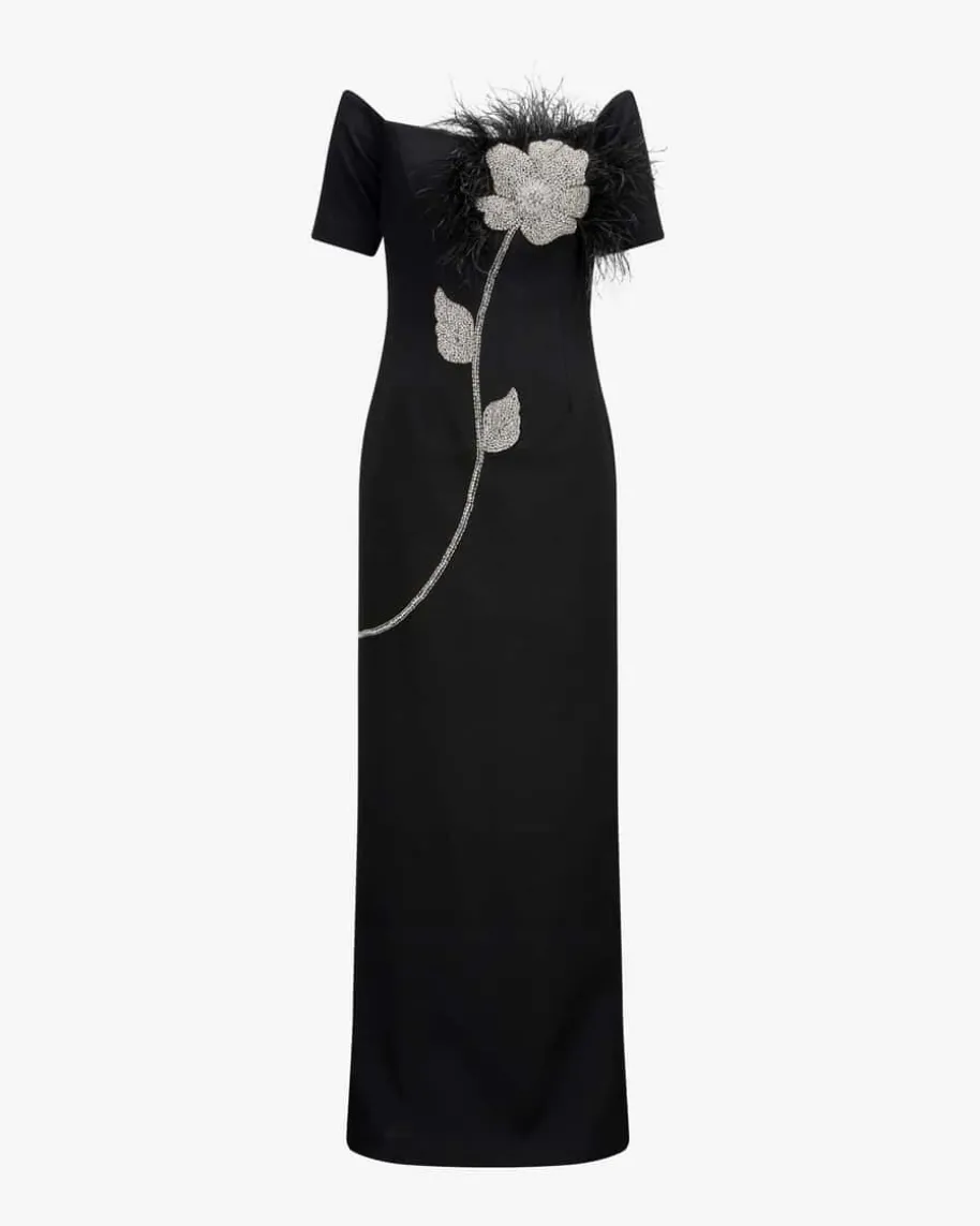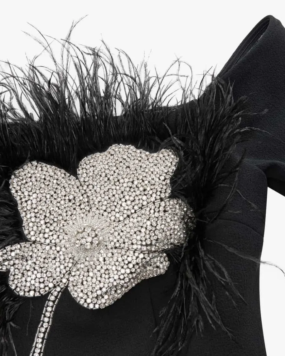 Starlight Kleid für Damen von Rebecca Vallance in Schwarz. Das taillierte Modellmit extravaganten Schmuckstein-Applikationen und Straußenfeder-Besatz zeigt sichals modischer Favorit. – Perfekt für besondere Anlässe, vereint es Stil undRaffinesse in einem atemberaubenden Design.