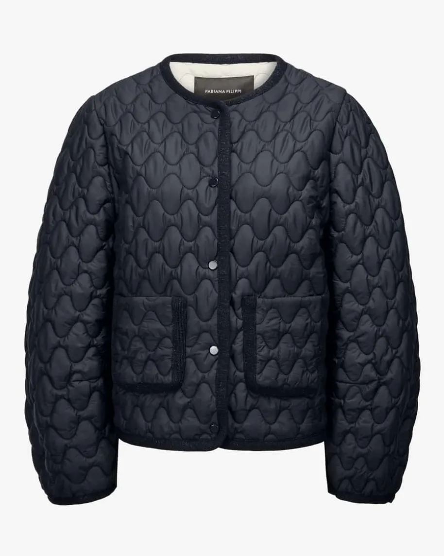 Steppjacke für Damen von Fabiana Filippi in Navy. Das Modell überzeugt sowohlhaptisch als auch optisch mit leichter Wattierung und wellenförmigen Steppmusterund avanciert so zum modischen Blickfang für stilvolle Pre Fall-Looks. Dieschmalen Strickbündchen mit changierenden Glitzerfasern runden den modischenStyle gekonnt ab.
