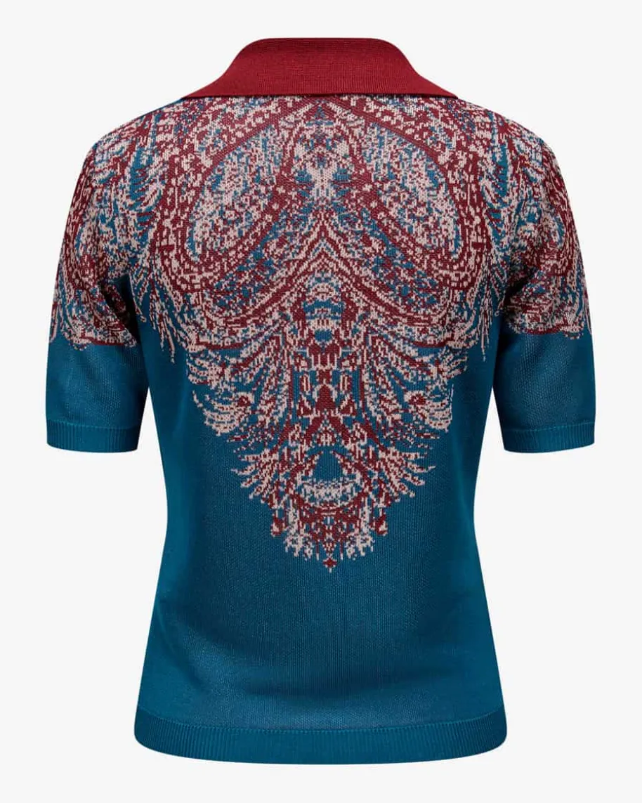 Strick-Poloshirt für Damen von Etro in Petrol, Bordeaux und Altrosa. Dank desfloralen Allover-Dessins besticht das Modell in stilvoller Aufmachung, währenddie elastische Material-Qualität ein angenehmes Tragegefühl verspricht.