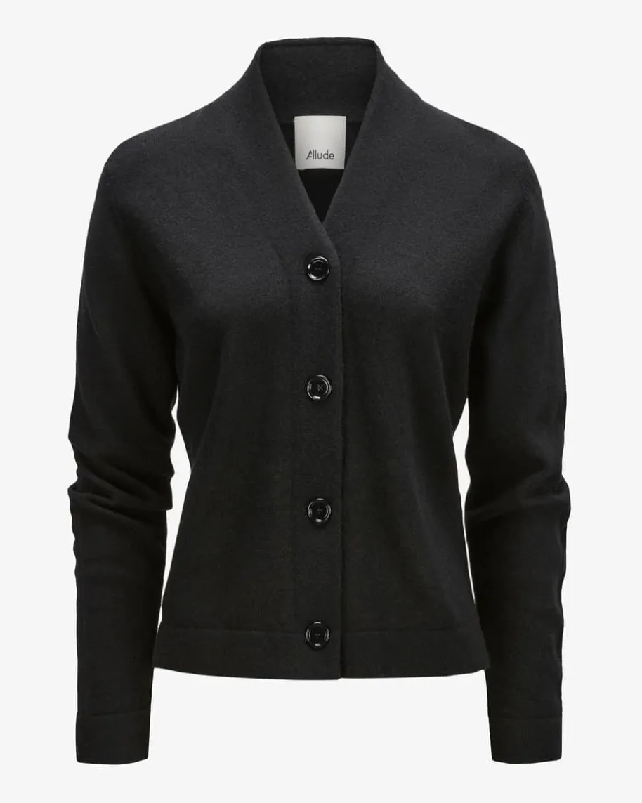 Strickjacke für Damen von Allude in Schwarz. Das Münchner Label wurde 1993 vonAndrea Karg gegründet und ist bekannt für luxuriöse Strickmode aus edlemCashmere. Auch dieses Modell überzeugt mit weichem Schurwolle-Cashmere-Mix infeiner Strick-Qualität, während die tonalen Knöpfe den cleanen Look gekonntergänze und einen femininen Begleiter kreieren.