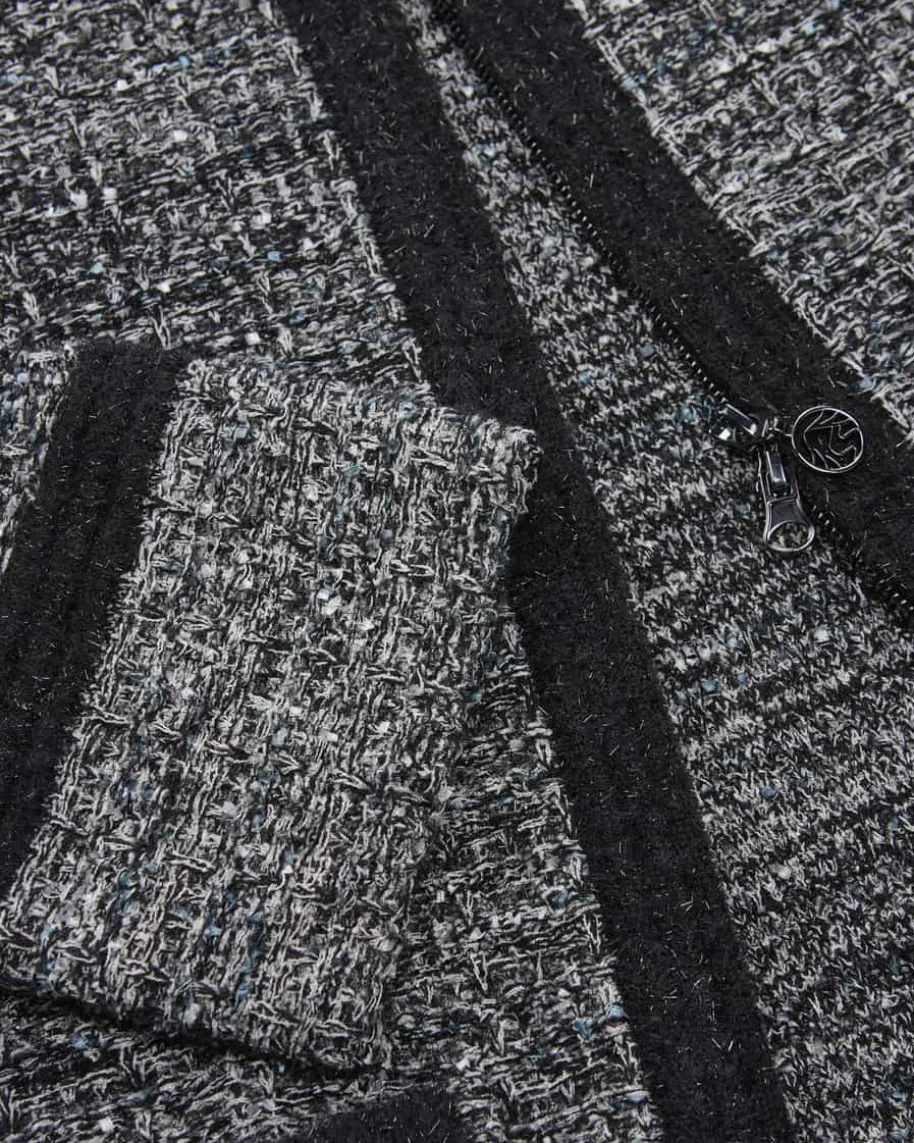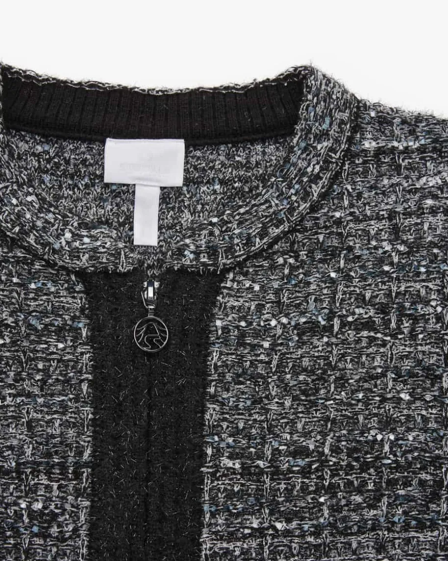 Strickjacke für Damen von Sportalm Emotion in Schwarz, Weiß und Blau. Das Modellbegeistert mit elastischer Material-Qualität im Tweed-Design, wodurch ein hoherTragekomfort und eine Blazer-Optik entstehen. Feine Lurex-Fasern setzen zugleichchangierende Akzente. Für einen feminin-eleganten Gesamt-Look kombinieren Sieden passenden Rock.