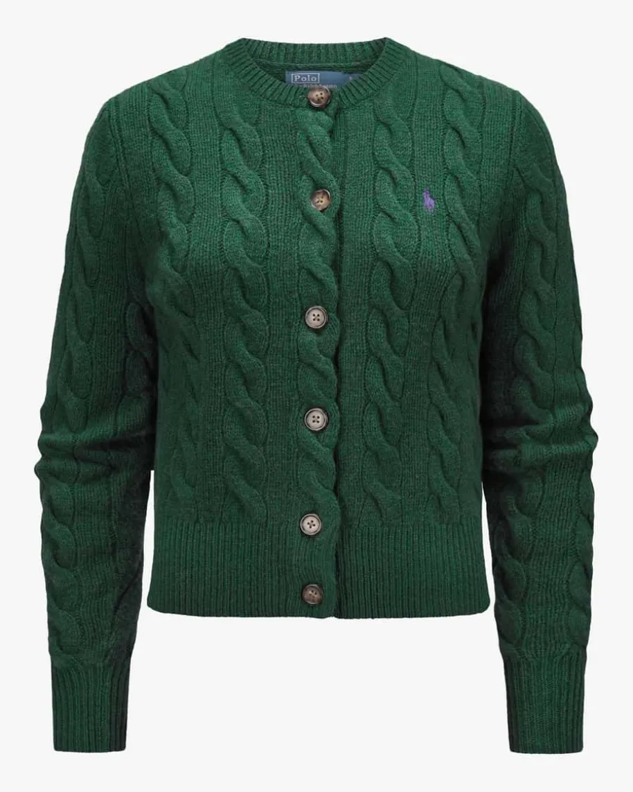 Strickjacke für Damen von Polo Ralph Lauren in Flaschengrün. Qualität,Lifestyle,Authentizität und zeitlose Eleganz – all das zeichnet die Marke Polo RalphLauren seit nunmehr 50 Jahren Firmengeschichte aus. Das Modell begeistert durchden besonders weichen Wolle-Cashmere-Mix mit hohem Tragekomfort. Stilvollabgerundet wird das Design durch die kontrastierende Logo-Stickerei auf derBrust sowie das klassische Zopf-Strickmuster.