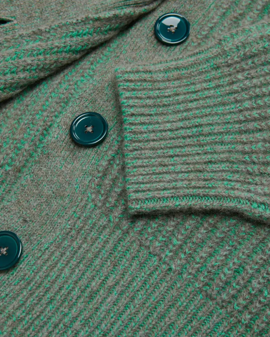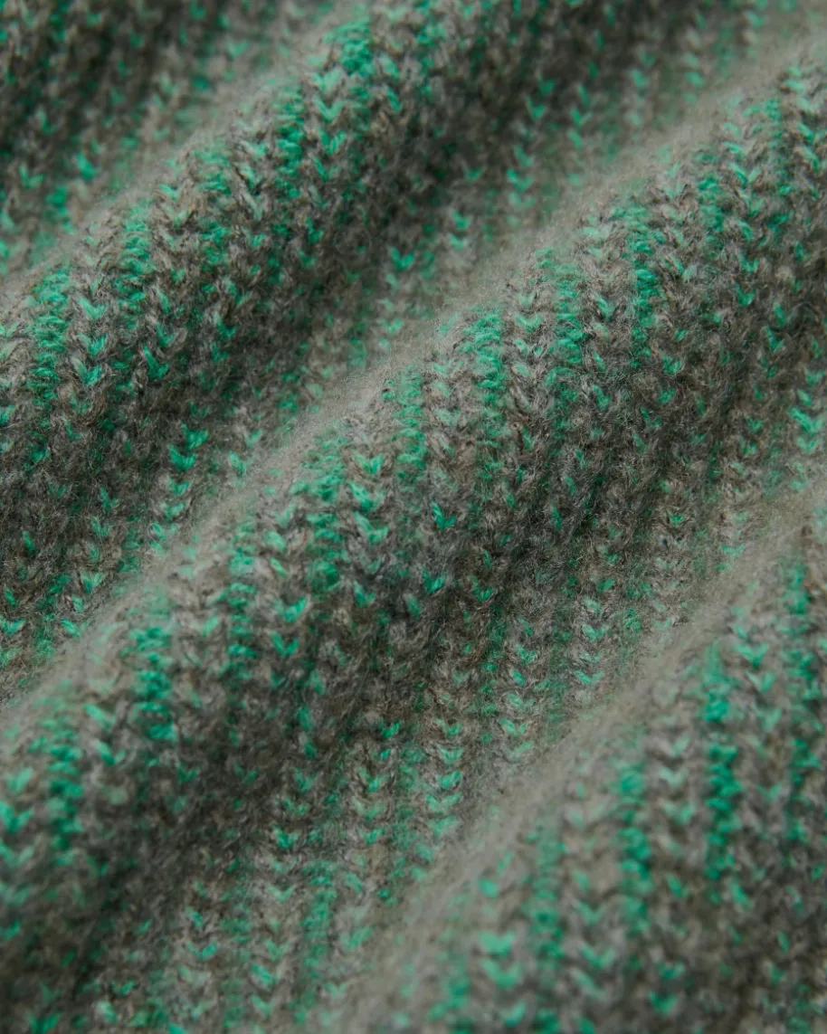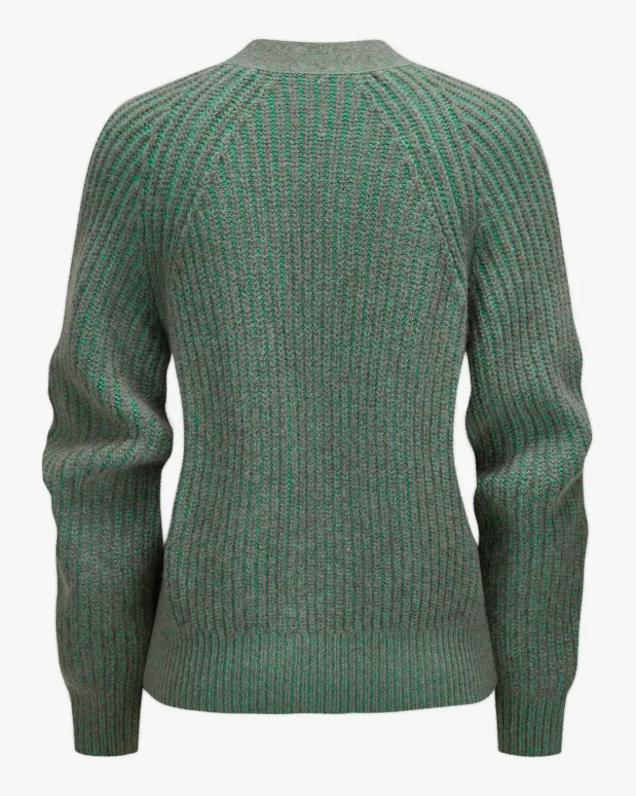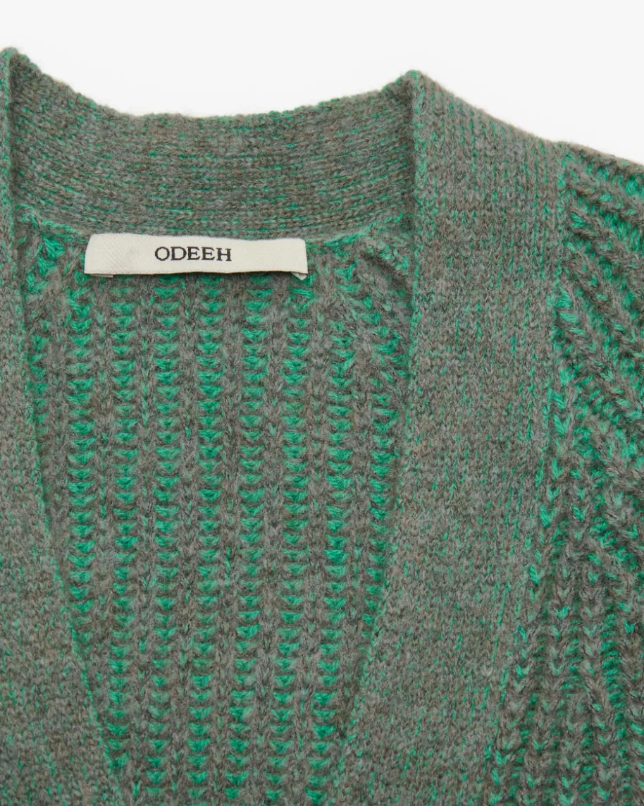 Strickjacke für Damen von Odeeh in Grün und Grau. Das Modell präsentiert sichmit weiter Silhouette und modernem Bicolor Rippstrick-Design, welches durch denhochwertigen Schurwoll-Cashmere-Mix mit weichem Griff überzeugt.