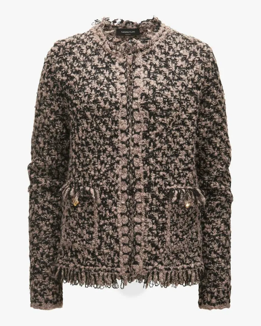 Strickjacke für Damen von Fabiana Filippi in Schwarz und Taupe. Die italienischeMarke steht für moderne Eleganz, hochwertige Materialien und dezente Farbwelten.Das Bouclé-Modell überzeugt sowohl haptisch als auch optisch in angenehmem Woll-Mix, während eingearbeitete Pailletten- und Fransen-Details einen eleganten Lookzaubern.