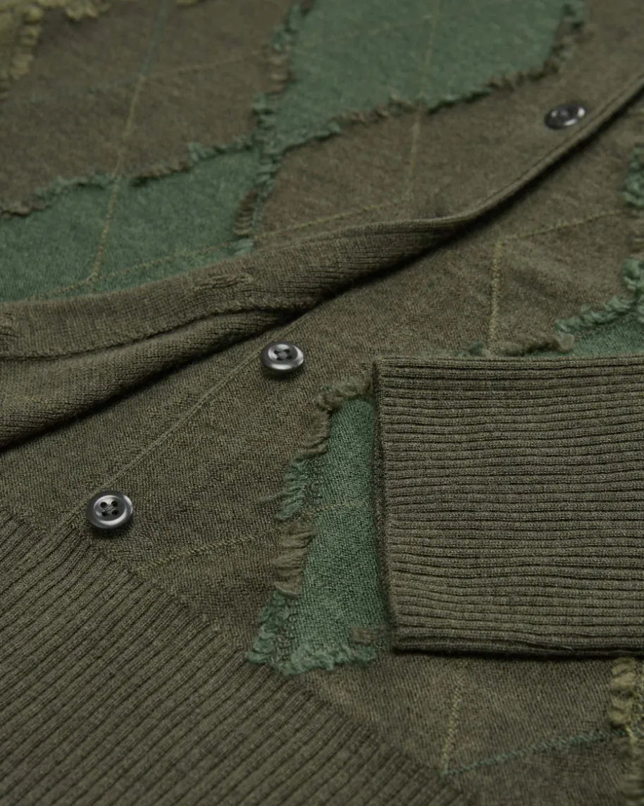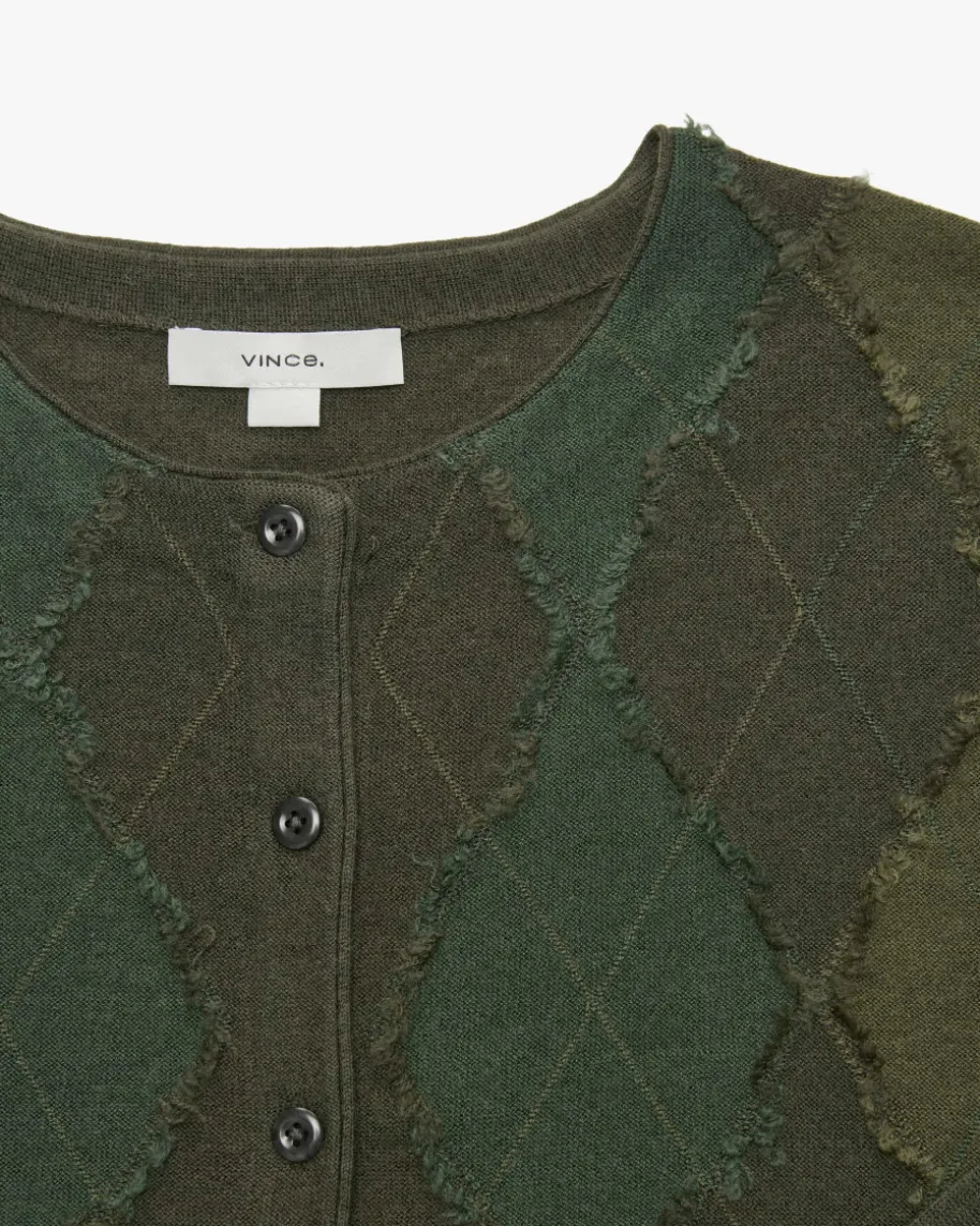 Strickjacke für Damen von Vince in Oliv, Dunkeloliv und Moosgrün. Das Modellpunktet dank dem dünnen Woll-Cashmere-Mix in femininer Aufmachung, während dasRauten-Strick-Dessin mit Fransen-Details entlang der Kanten eine extravaganteNote verleiht.