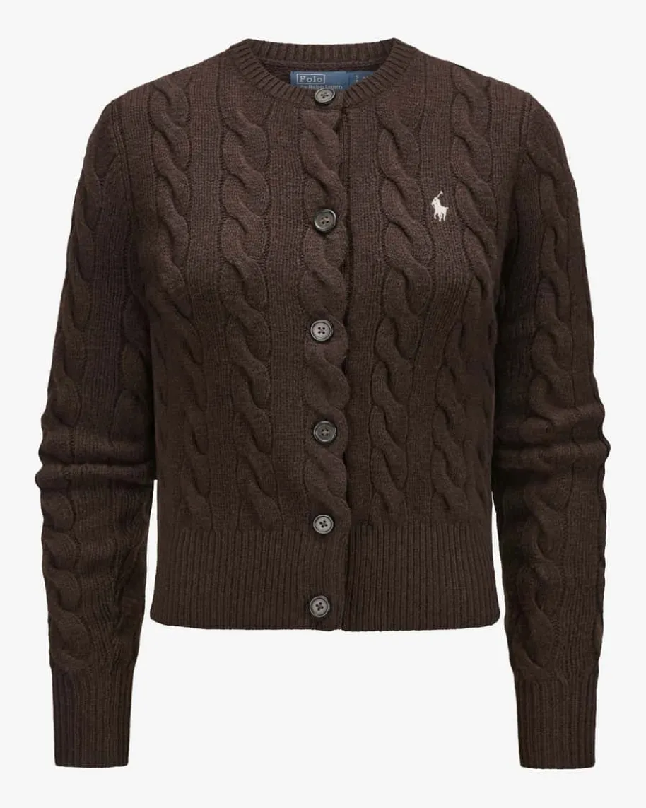 Strickjacke für Damen von Polo Ralph Lauren in Dunkelbraun. Qualität, Lifestyle,Authentizität und zeitlose Eleganz – all das zeichnet die Marke Polo RalphLauren seit nunmehr 50 Jahren Firmengeschichte aus. Das Modell begeistert durchden besonders weichen Wolle-Cashmere-Mix mit hohem Tragekomfort. Stilvollabgerundet wird das Design durch die kontrastierende Logo-Stickerei auf derBrust sowie das klassische Zopf-Strickmuster.