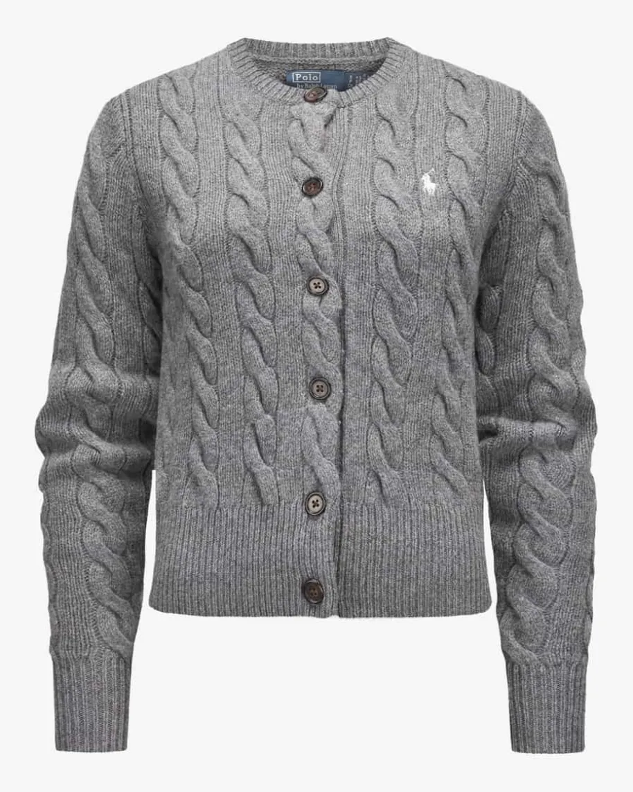 Strickjacke für Damen von Polo Ralph Lauren in Anthrazit. Qualität, Lifestyle,Authentizität und zeitlose Eleganz – all das zeichnet die Marke Polo RalphLauren seit nunmehr 50 Jahren Firmengeschichte aus. Das Modell begeistert durchden besonders weichen Wolle-Cashmere-Mix mit hohem Tragekomfort. Stilvollabgerundet wird das Design durch die kontrastierende Logo-Stickerei auf derBrust sowie das klassische Zopf-Strickmuster.