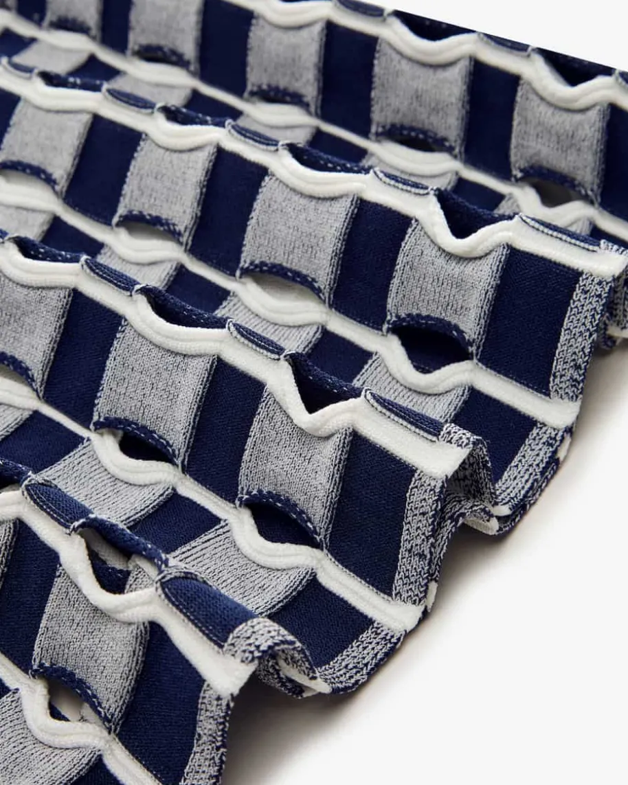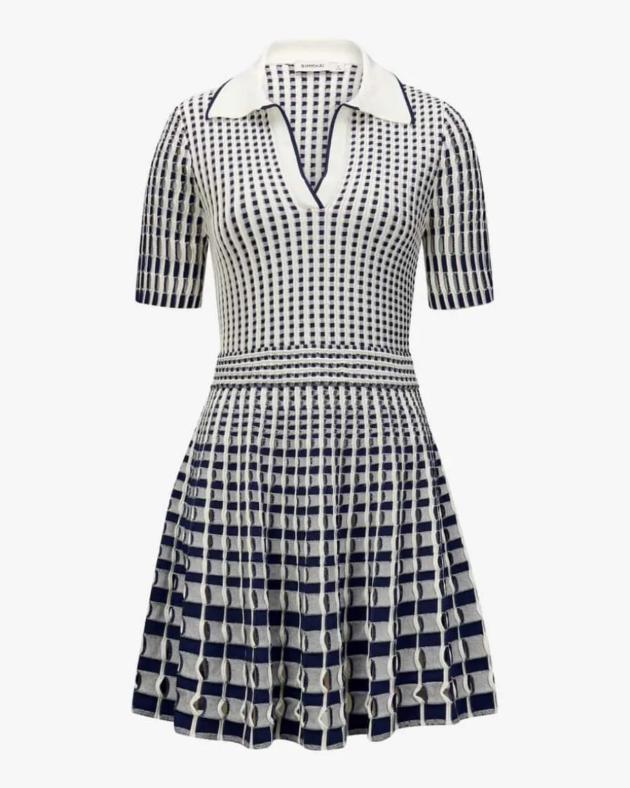Strickkleid für Damen von Simkhai in Weiß und Dunkelblau. Der aus New Yorkstammende Designer Jonathan Simkhai interpretierte für seine Entwürfe dieVorstellung von femininer Mode neu und verlieh seinen Designs eine sinnliche undkraftvolle Ausstrahlung. Auch dieses Modell präsentiert sich mit raffinierterStrick-Verarbeitung mit grafischem Muster in semi-transparenter Optik. Dermodische Look wird mit dem geschlitzten Polokragen sportiv ergänzt und schaffteinen Style mit dem gewissen Etwas.
