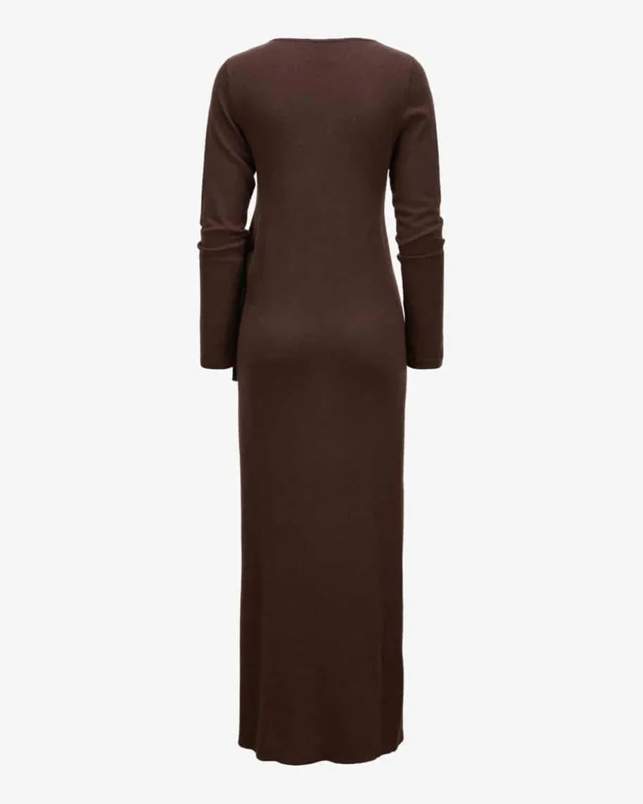 Strickkleid für Damen von Allude in Schoko. Das Münchner Unternehmen Alludesteht für Mode, die Selbstbewusstsein und zeitlose Individualität ausstrahlt.Gefertigt aus hochwertigem Woll-Cashmere-Mix, besticht das Maxi-Modell mitweichem Griff und leichter Strick-Haptik, während die klassische Silhouettedurch das seitliche Knoten-Detail einen besonderen Touch erhält.