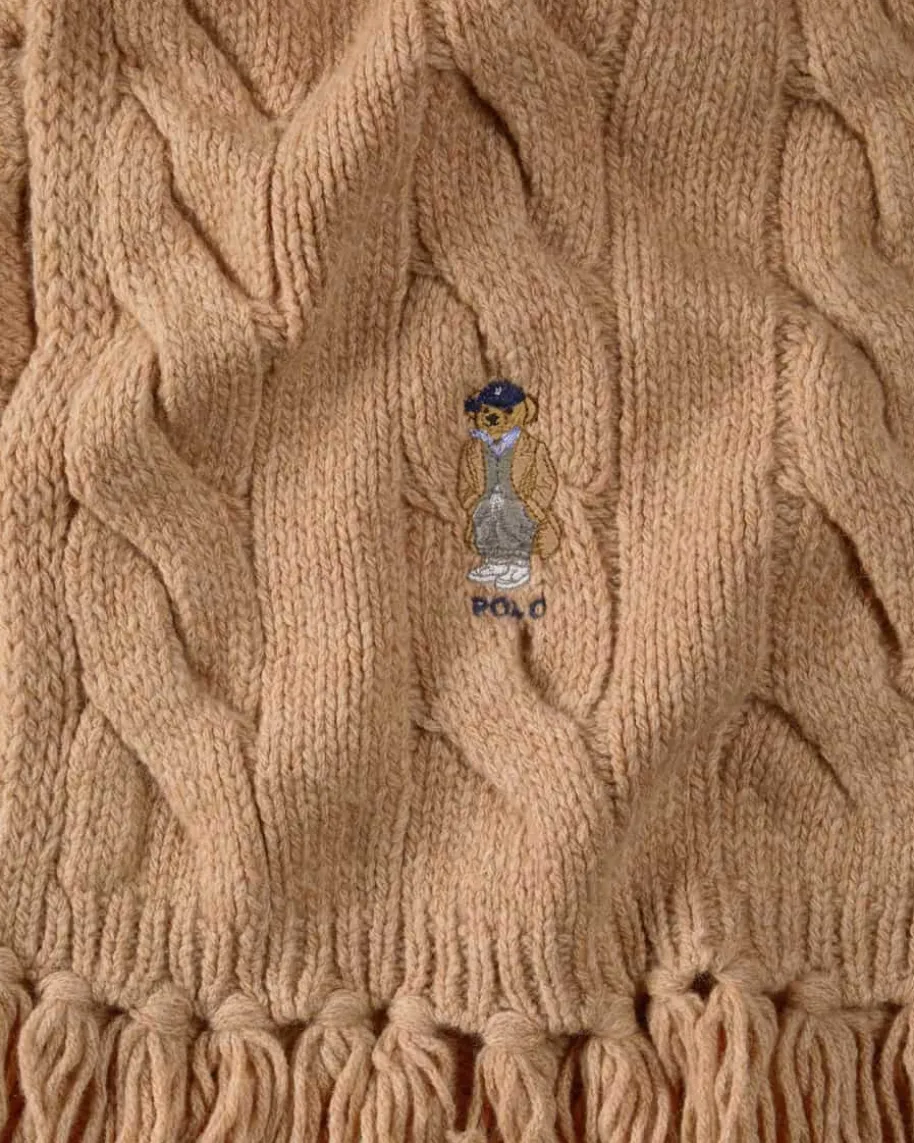 Strickschal für Damen von Polo Ralph Lauren in Camel. Das Modell präsentiertsich dank des hochwertigen Woll-Mix im Zopfstrick-Design als modischer Favoritmit angenehmem Griff, während die detailverliebte Polobären-Stickerei demGesamtbild eine charakteristische Note verleiht.