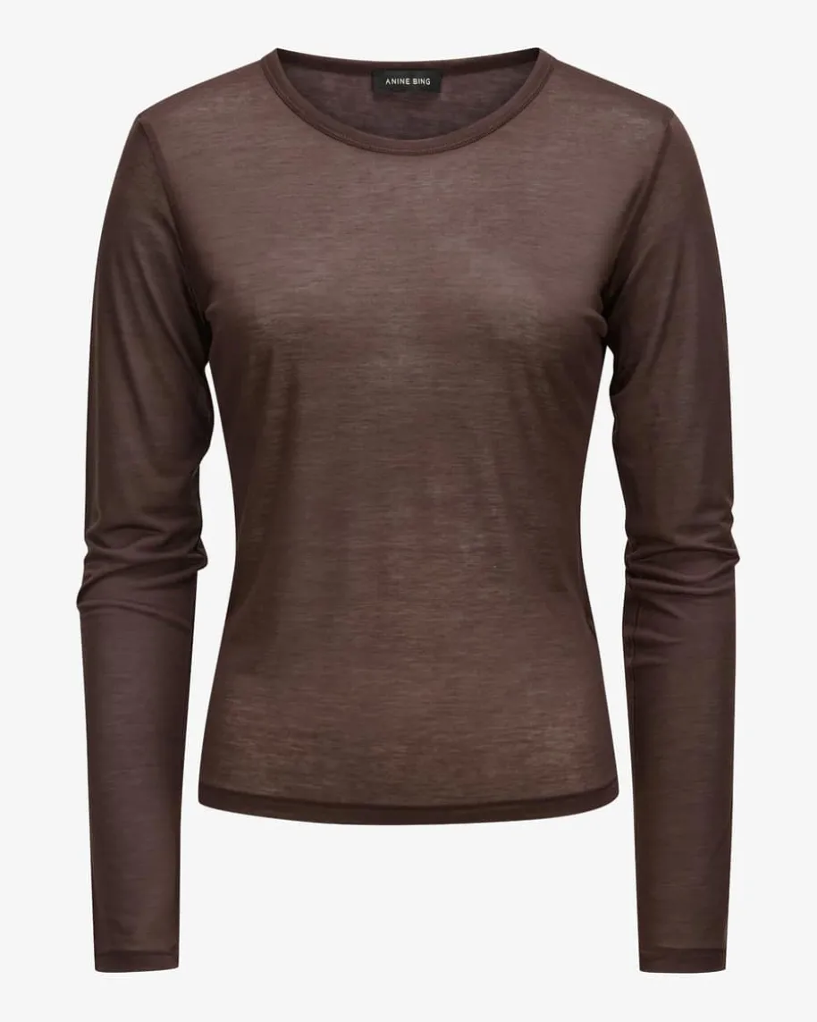 Sylvie Longsleeve für Damen von Anine Bing in Chocolate. 2012 in Los Angelesgegründet, vereint das Label skandinavischen Minimalismus mit amerikanischerCoolness. Das Modell in hochwertigem Lyocell-Woll-Mix überzeugt in Semi-transparenter Aufmachung und femininer Passform, während die cleane Aufmachungein zeitloses Essential kreiert das sich vielseitig kombinieren lässt.