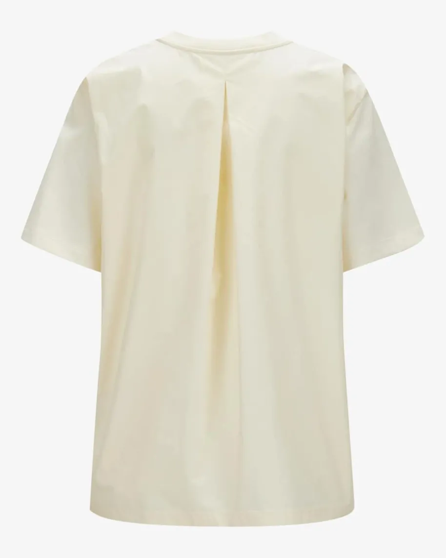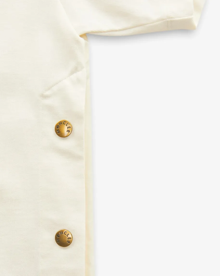 T-Shirt für Damen von Moncler in Creme. Das weit geschnittene Modell präsentiertsich dank der raffinierten Material-Kombination aus unterschiedlicher Baumwoll-Verarbeitung sowie der markanten Seitenschlitze mit Druckknöpfen mit besonderemCharakter, wobei sich die Rückseite im stilvollen Blusen-Look inszeniert.