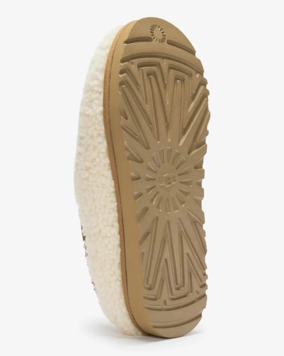 Tasman Maxi Curly Pantoletten für Damen von Ugg in Creme und Camel. Das Modelldes Kult-Labels überzeugt dank dem weichen Lammfell mit einem hohen Wohlfühl-Faktor. Während das tasmanische Flecht-Detail den Schuh modisch abrundet.