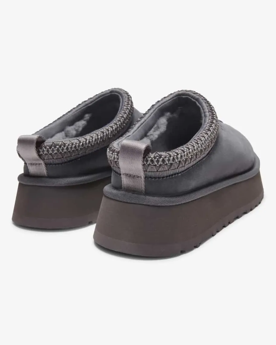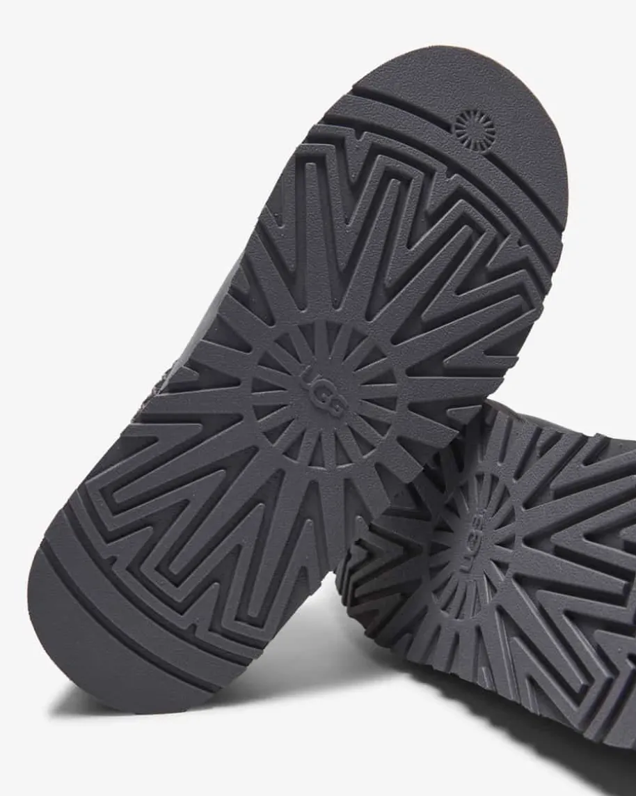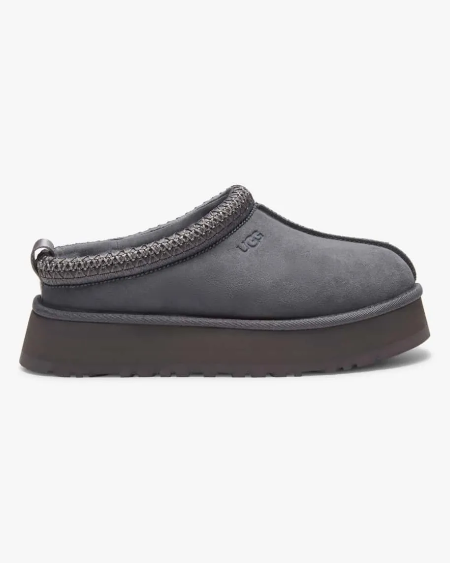 Tazz II Pantoletten für Damen von Ugg in Anthrazit. Das Modell des Kult-Labelsüberzeugt dank des weichen Lammfell-Futters mit hohem Wohlfühl-Faktor, währenddas hochwertige Veloursleder ein zeitloses Design kreiert. Zusätzlich rundet dastasmanische Flecht-Detail den Schuh modisch ab.