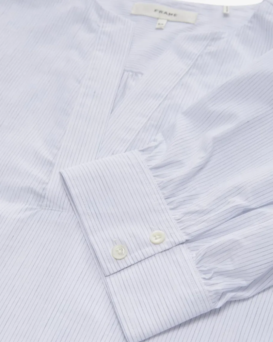 The V Neck Bluse für Damen von Frame in Weiß und Blaugrau. Das Modellpräsentiert sich in hochwertiger Baumwoll-Leinen-Qualität welche für angenehmeTragemomente sorgt, während das feine Streifenmuster in Kombination mitklassischen Details einen sommerlichen Begleiter kreiert der sich vielseitigstylen lässt.