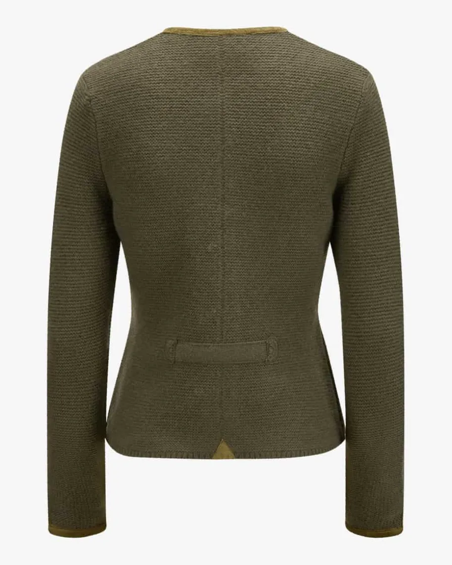 Trachten-Cashmere-Strickjacke für Damen von Lodenfrey in Oliv. Das Modellbesticht dank der taillierten Passform mit einer modisch-femininen Ausstrahlung,während die hochwertige Cashmere-Qualität einen angenehm-weichen Begleiter fürtraditionelle Looks kreiert.
