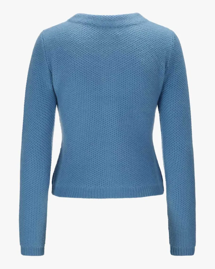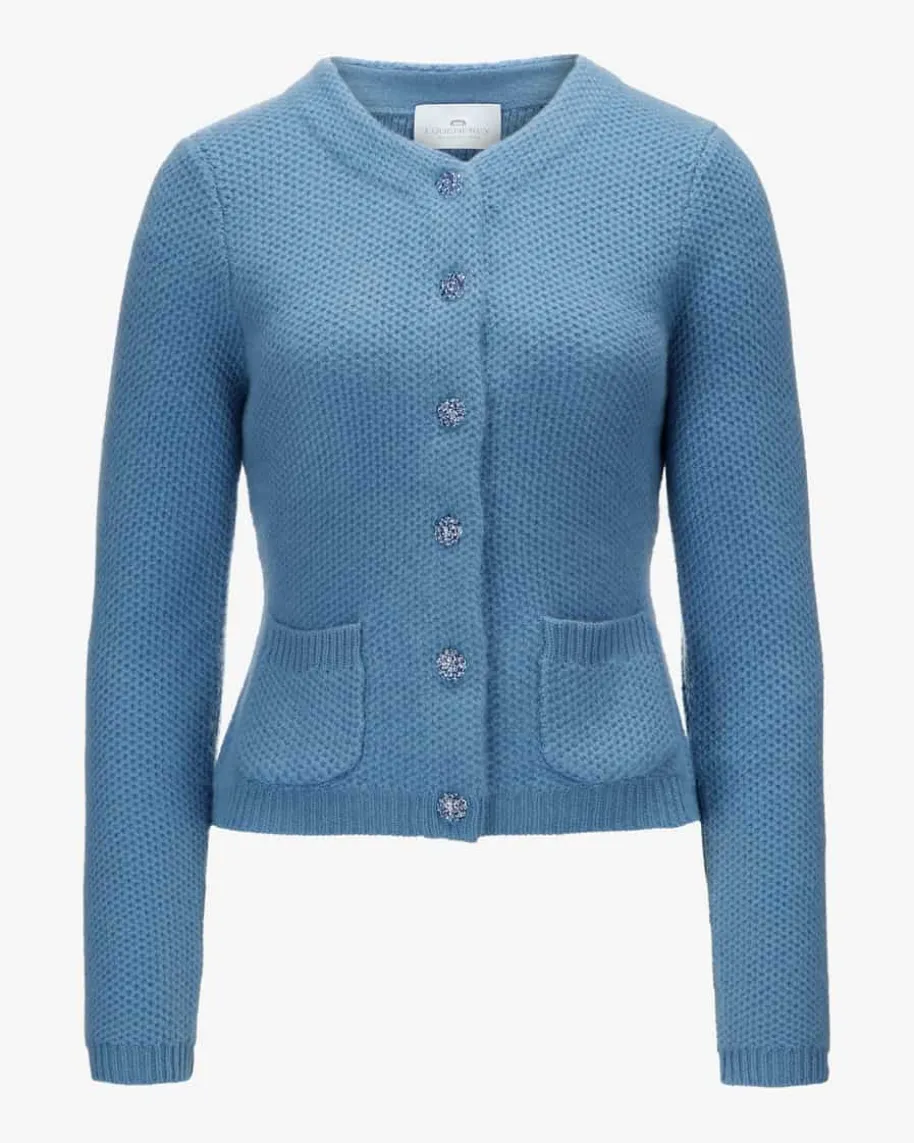 Trachten-Cashmere-Strickjacke für Damen von LODENFREY München 1842 in Blau.Tradition und Moderne in perfektem Zusammenspiel – Das Modell begeistert durchdie klassische Linksstrick-Qualität, während Schmuckstein-Knöpfe den Trachten-Look charmant abrunden.