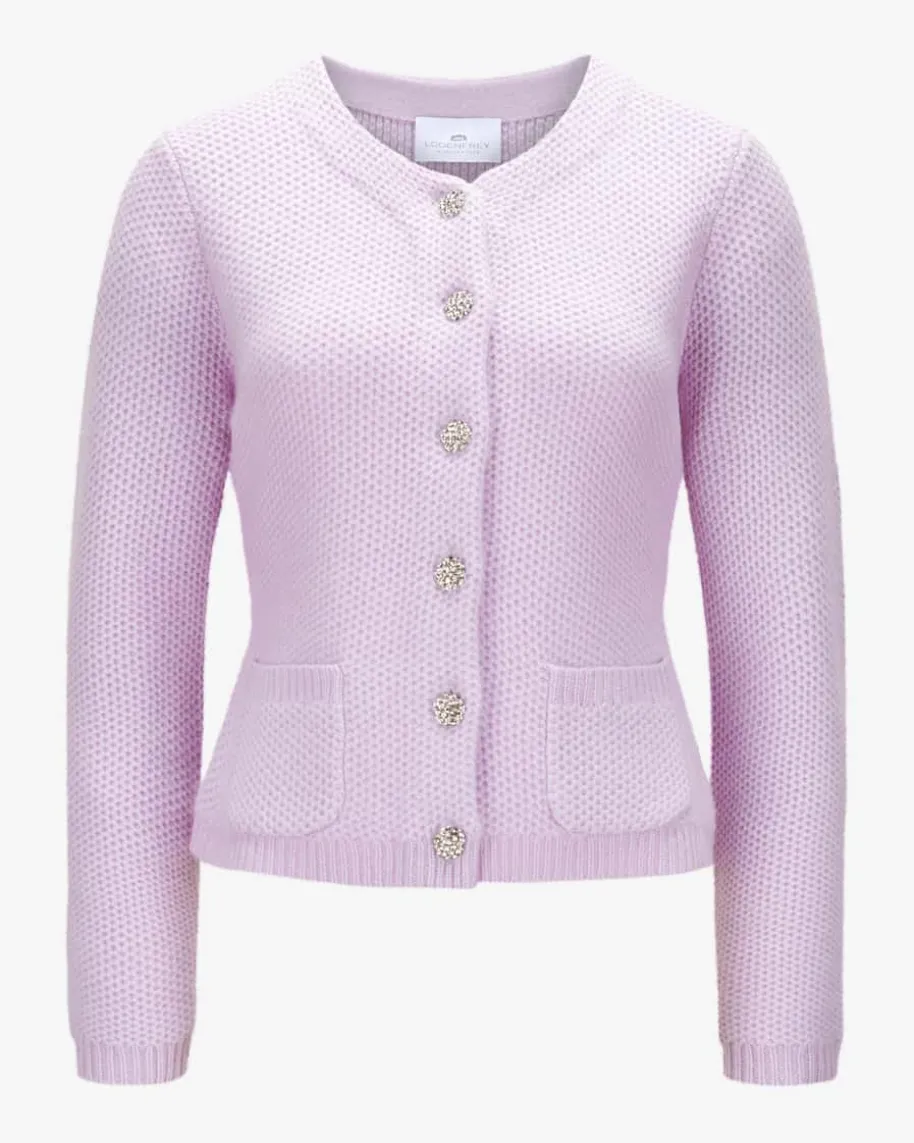 Trachten-Cashmere-Strickjacke für Damen von LODENFREY München 1842 in Flieder.Tradition und Moderne in perfektem Zusammenspiel – Das Modellbegeistert durch die klassische Linksstrick-Qualität, während Schmuckstein-Knöpfe den Trachten-Look charmant abrunden.