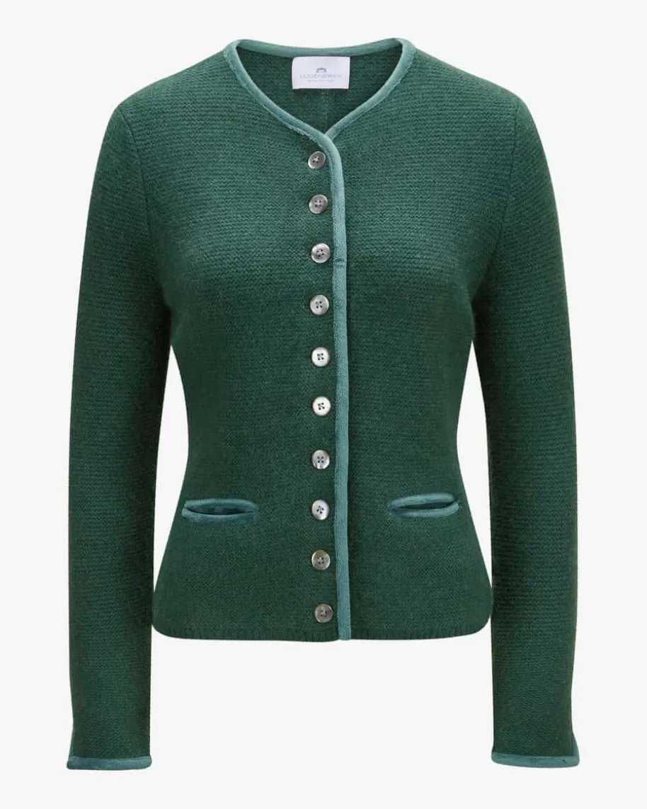 Trachten-Cashmere-Strickjacke für Damen von Lodenfrey in Flaschengrün. DasModell besticht dank der taillierten Passform mit einer modisch-femininenAusstrahlung, während die hochwertige Cashmere-Qualität einen angenehm-weichenBegleiter für traditionelle Looks kreiert.