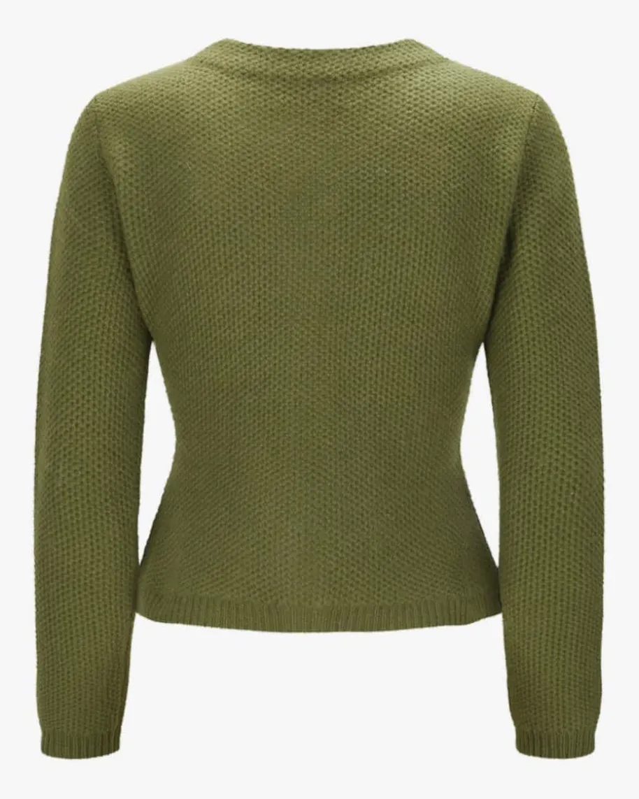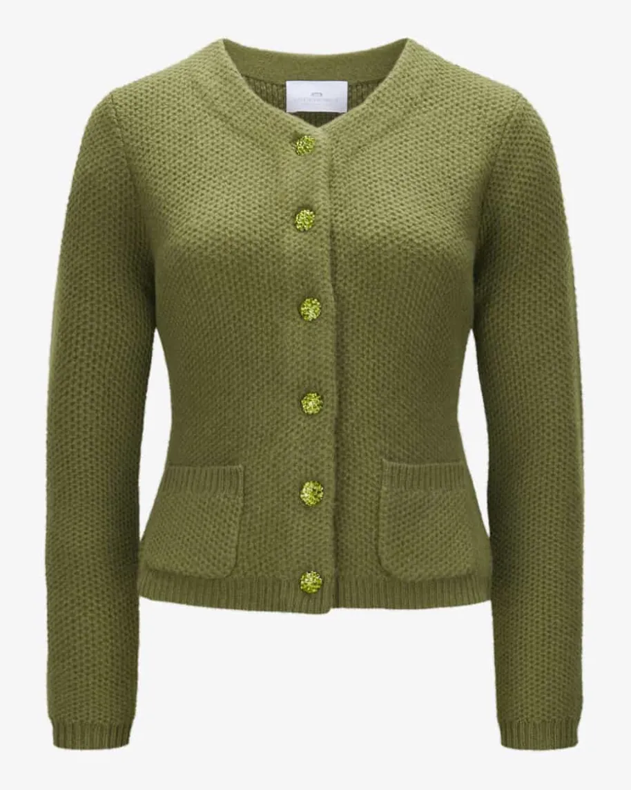 Trachten-Cashmere-Strickjacke für Damen von LODENFREY München 1842 in Oliv.Tradition und Moderne in perfektem Zusammenspiel – Das Modellbegeistert durch die klassische Linksstrick-Qualität, während Schmuckstein-Knöpfe den Trachten-Look charmant abrunden.