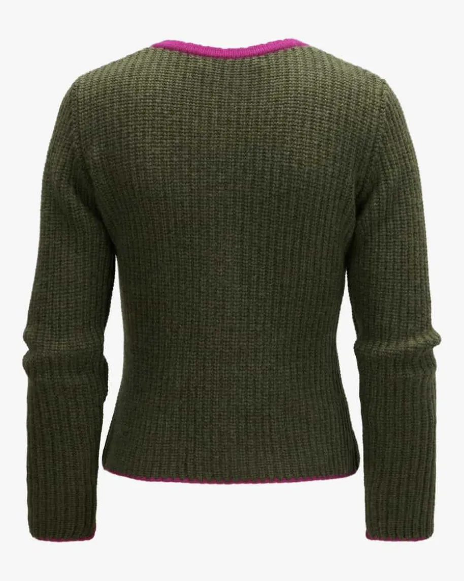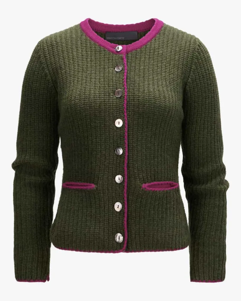 Trachten-Strickjacke für Damen von Pierre Claire in Oliv und Pink. Derhochwertige Merinowoll-Cashmere-Mix verleiht dem taillierten Modell eineunverwechselbare Haptik, während kontrastierende Strick-Partien sowie Perlmutt-Knöpfe einen traditionellen Trachten-Look schaffen.