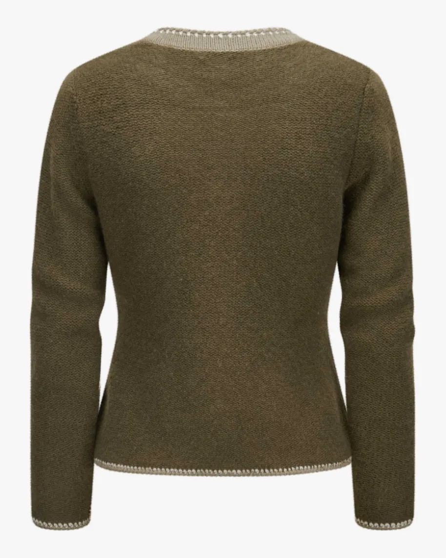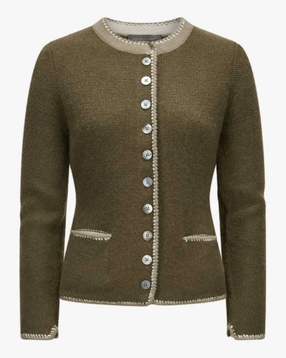 Trachtenstrickjacke für Damen von Pierre Claire in Oliv, Schilf und Creme. Diehochwertige Merino-Cashmere-Qualität verleiht dem klassischen Modell eineunverwechselbare Haptik, während die Perlmuttknöpfe sowie kontrastierendeElemente einen traditionellen Look mit moderner Note schaffen.
