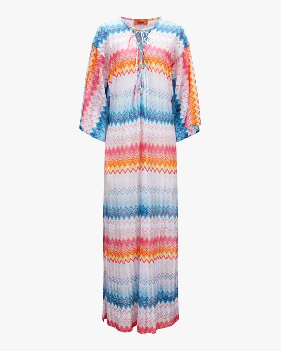 Tunika-Strickkleid für Damen von Missoni in Bunt und Silber. Perfekt als Cover-Up über Ihrer liebsten Bademode – Das weit geschnittene Maxi-Modell spiegeltdank des ikonischen Zickzack-Musters die Philosophie des Labels gekonnt wider,wobei die semitransparente Strick-Aufmachung mit metallischen Glitzerfaserneinen besonderen Strand-Favoriten schafft.