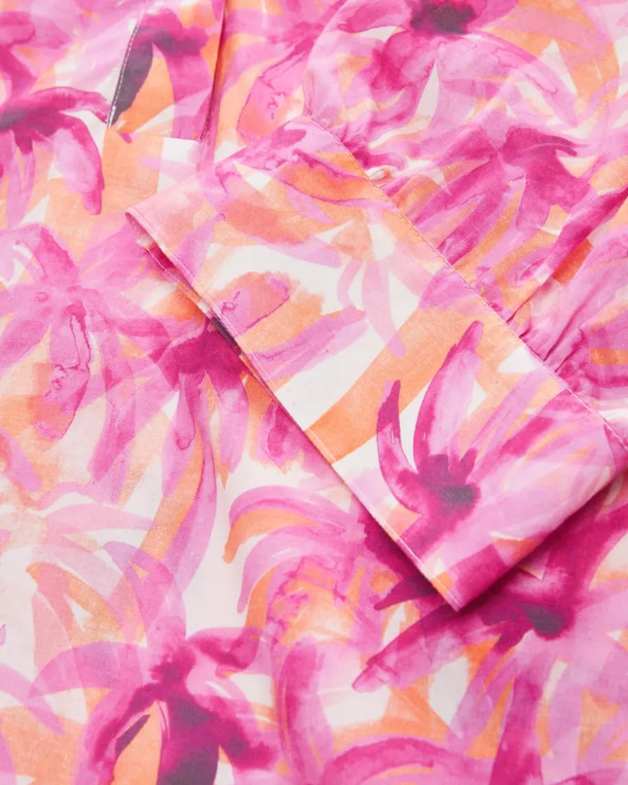 Tunikabluse für Damen von Caliban in Pink, Orange und Weiß. Das Modell punktetmit leichter Baumwoll-Qualität und lockerem Tunika-Schnitt, wodurch einsommerlicher Begleiter mit Stil geschaffen wird. Das aquarellige Allover-Dessinmit Palmen-Motiv rundet den Gesamt-Look gekonnt ab.