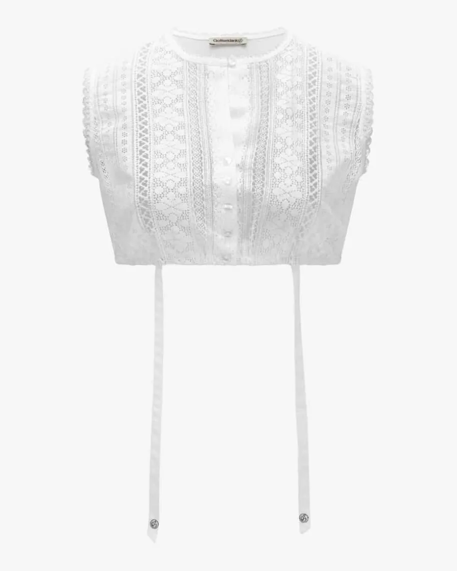 Viktoria Dirndlbluse für Damen von Gottseidank in Weiß. Das ärmellose Modellüberzeugt dank der elastischen Jersey-Qualität auf der Rückseite mit optimalenTragekomfort, während die feine Spitze sowie die Perlmutt-Knöpfeeinen stilvollen Liebling für modische Trachten-Looks zaubern. Zwei Bänder amGummibund erleichtern Ihnen das Richten der Bluse, nachdem Sie Ihr Dirndlangezogen haben.